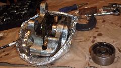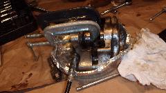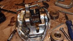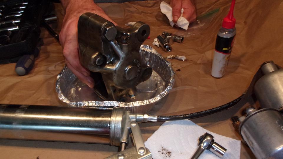 Yes I survived a night without sleep, still doing Part Numbers List grunt work in the morning. Then I was happy to get out of the room into daylight and fresh air by early afternoon, even though it was 90 degrees today. I got over to Marc's place to lend a hand with disassembling some brake calipers. They were old and in storage for a long time and stiff, and they would not come apart with air pressure, so we would use hydraulics. First move was to install my small bolt with Zerk fitting in the bottom port where the brake hose would normally connect. Then remove both bleed nipples and clean out the threads with a tap. Stand the caliper right side up, and squirt oil into one bleed port until it comes out the other top port. That expels all air from the cylinders, leaving only non-compressible oil inside. Then install and tighten the bleed nipples, connect the grease gun, and start pumping.