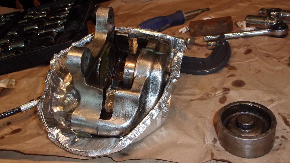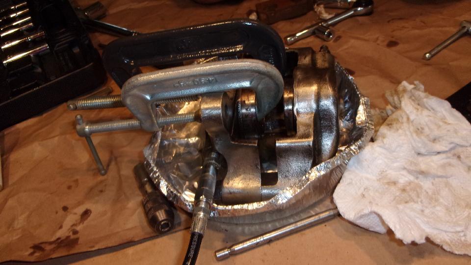 Once one of the pistons began to move, we installed a couple C-clamps to stop its progression, then continued pumping to get the other piston moving. when they were both about 2/3 extended we removed the C-clamps and continued pumping until one piston was completely out to be picked up with fingers. Then the PITA chore fighting the other piston with large pliers to pull it the rest of the way out of the bore, and yes we did ultimately succeed. It helps to have new pistons so you don't mind putting bite marks in the old ones.