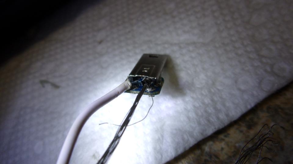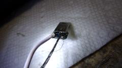 Then I had another thought. The power chord has only two wires, power and ground, that plug into a cigar lighter socket to provide power and re-charge the battery when in the car. Maybe I could cut and strip the chord and solder those two wires directly onto teh circuit board. That should get the battery recharged, which should get the unit working again. So we began hacking with a razor knife to remove the covering from the chord connector, intending to trace the leads to verify which contacts on the circuit board would be power and ground. Got that far okay, but then Navigator reminded me that we need to do a data dowload occasionally, maybe once a year, and for that we need the 5-pin connector for another signal cable to plug into the computer.