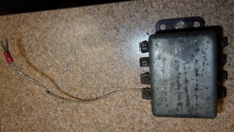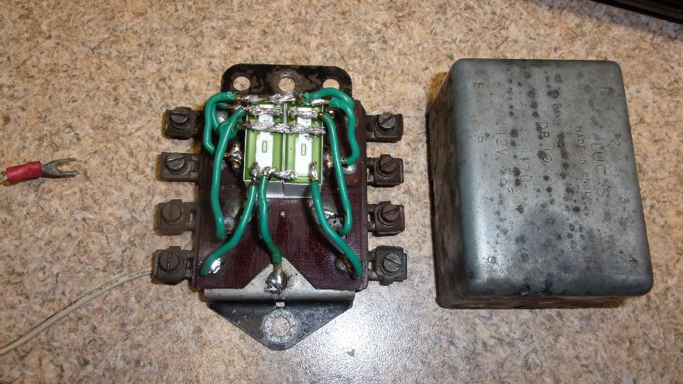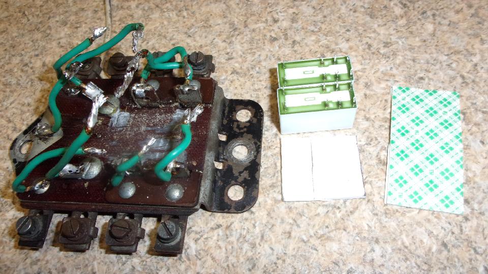 The new 12-volt miniature relays came in yesterday, so time to rebuild the turn signal relay unit, again (for the third time). But it's getting easier with time. Back in the mid 90's when I was first having problems with the original relays, about the second time I had to crawl under the dash to work the loose screws, I installed a metal bar with captive studs. Now I can pop the relay cover off and remove two hex nuts with lock washers under the bonnet to R&R the relay unit. Easy-peasy