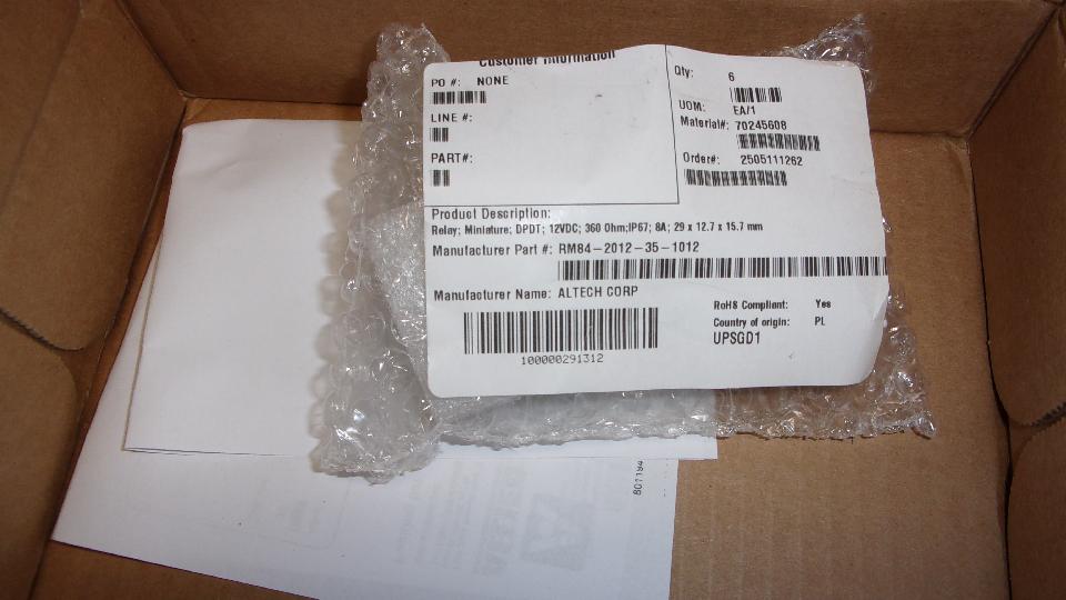Ah, my little relays from Allied Electronics came in (yesterday, I think). These folks know how to pack delicate parts. You could stand on this box. Nice relays. These are the higher temperature rating this time, 85dC, 185dF. Altech Corp RM84-2012-35-1024. On the relay is RELPOL made in Poland. Oops, damn! While I was reviewing the temperature rating I noticed I accidentally ordered 24-volt coil rather than 12-volt, so time to re-order. And the 12-volt relays are going to be on back order for a couple weeks, so I guess I will have to hot wire my turn signals in the meantime. Stay tuned.