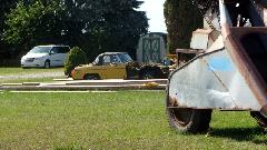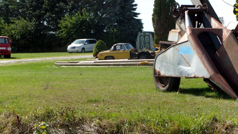 Midget we have been driving by for the past few weeks. The vehicle (machine) in the right foreground is a one-row corn picker. That one is so old we didn't even have one of those on the farm when we were buying used equipment in the early 1950's. Post-war, when we stopped picking corn by hand and bought a machine, it was a well used 2-row picker pulled by tractor and driven by PTO (Power Take-Off). I'd like to take a closer look at this one, but it may be chain driven from the ground wheels to be pulled by a horse (or mule).