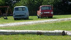Following the log poles a bit to the left there were also a pair of old Dodge trucks. The White one is a flat nose van, while the red one is a flat nose pick-up truck. These are 1960-1964 model range. I drove a Dodge van like that for one day in late 1968 when a friend borrowed one from a dealer used car lot for a test drive (never did buy it). In 1972 I bought a 1960 Ford Falcon window van (very similar design) which I drove regularly until 1976 when it got swapped for a 1974 Datsun Lil Hustler P/U truck (a wonderfully rugged little vehicle).