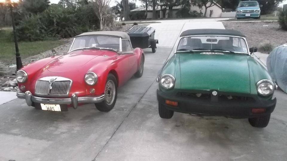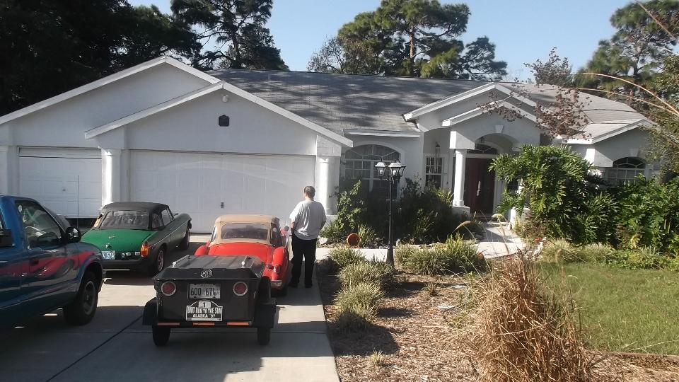 Review mail and BBS early, but no news from CMGC editor yet. Then time to head west a couple more hours. Arrive mid afternoon in Spring Hill FL to meet Jay Gerding. That's his green MGB, and a TR8 with a nose bob. There is also a TR7 under a cover beside the MGB, and some spare MGB body parts hiding behind the garage.