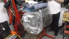 Lots of burbling underneath, turned out to be a substantial exhaust leak at inlet to the 2-to-1 transition pipe. Apparently not enough overlap for one of the tubing lap joints, soon covered and sealed with a padded band clamp. But the 2-to-1 pipe has some more minor cracks an needs to be replaced (for another day). Meanwhile, set ignition timing and fuel mixture and idle speed, so it also runs well. And it was a delightful test run indeed. But while we had it jacked up we found a very wobbly LF wheel. This turned out to be deteriorated rubber bushings in the top trunnion, so order up some parts, and something more for another day.