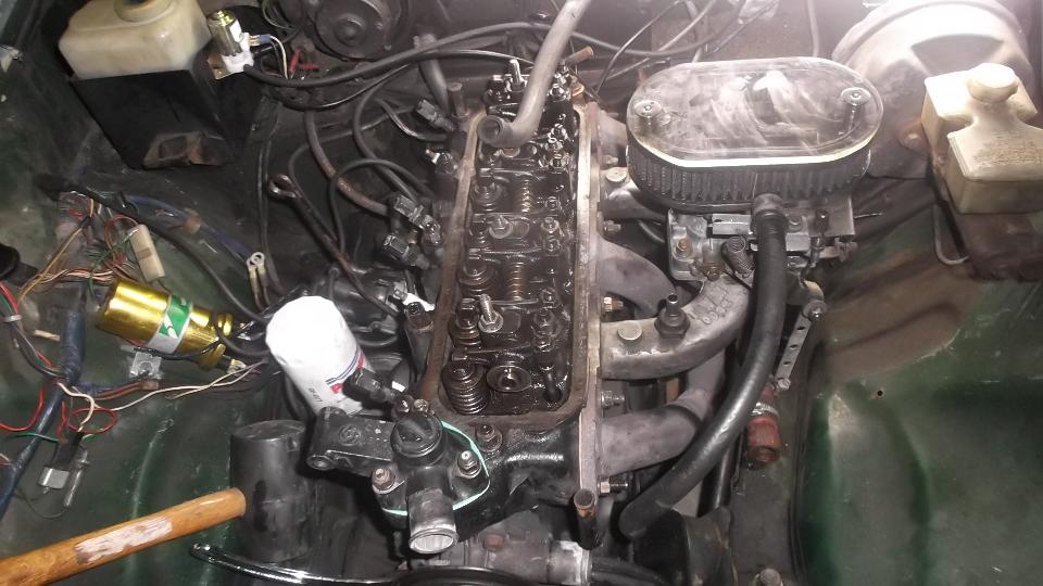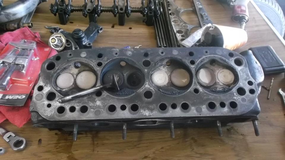 Half a day working on CMGC newsletter conversion from Publisher to web page format, and a late brunch. Then get to work on the MGB while there is still some daylight. Find a good used exhaust valve, and hand lap it into place (actually quick and easy). Reassemble valve spring parts, invert head, and pour in some thin fluid to assure the valves do not leak. Clean head and block, and install the cylinder head with new gaskets.