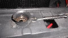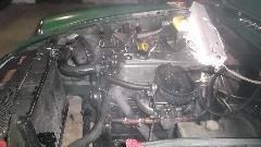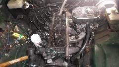 Three pipes, brakes, clutch and fuel line, were all improperly routed, having large upward bow above the back end of the engine. A little effort re-routed the clutch pipe lower and much more horizontal. Then jacked up the left side of the car to encourage air bubbles to work their way back up to the master cylinder, and as magic prevailed we had good clutch function. Wanting to test the clutch, but the battery was dead flat, so we attached the charger. Find one missing bolt at bottom of the clutch master cylinder, two missing bolts at bottom of the bellhousing, two more mismatched bolts in the bellhousing, leading to a trip to the local auto parts store to re-stock our inventories of fasteners. By the time we had all the proper bolts installed, the battery was charged up enough to start the engine.