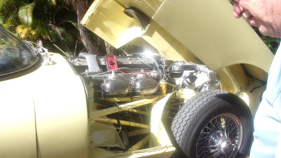 Then we have a new club member who brought in a Jaguar E-Type on a trailer. He lives somewhere farther north, but brought the Jag to Florida to be able to drive it here during his winter Florida visits. All was well until it quit running while he was driving it, so now we get to fix it. Guys were mucking around changing and testing coils with no success. For a 10-second test, I gave it a short spray of starting fluid and still no fire, so obviously no spark (and probably not a bad coil). So grab a test light to immediately discover no power on the white wire to the coil when ignition switch was on.