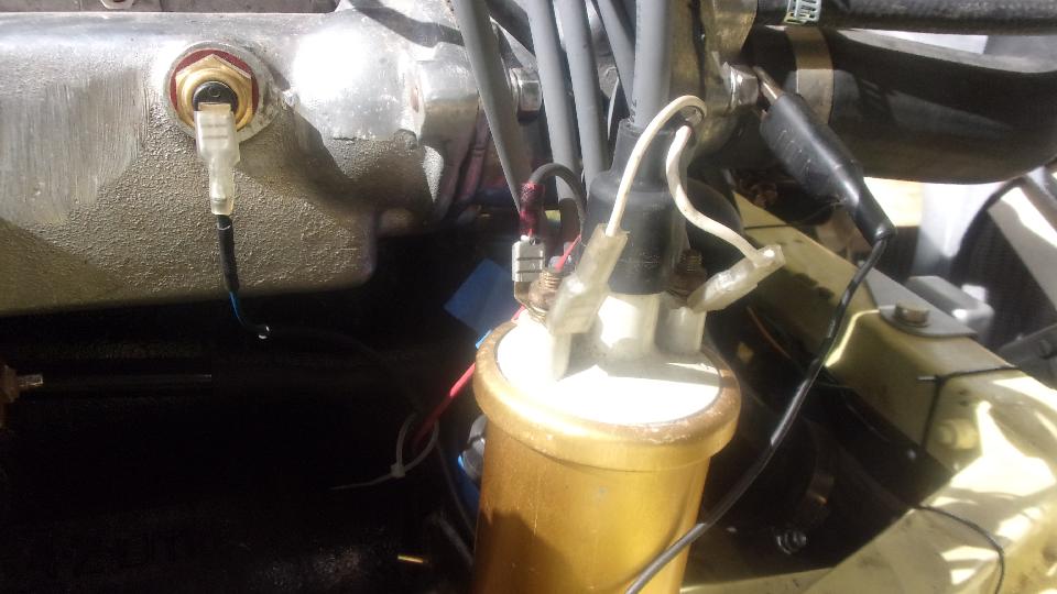 Not knowing exactly where the bad connection was, we collectively didn't trust it not to happen again. So we made up a long white jumper wire, and installed add-on spade connectors on the fuse input and on the coil input. Keep the jumper wire in the car just in case, and we could send the car home with a big smile on the face of the owner. -- Current good news, my new cell phone battery just arived, and it shows 35% charge on installation. A few hours on charge brought it right up to 100%, and running cool.