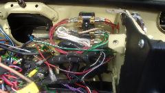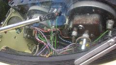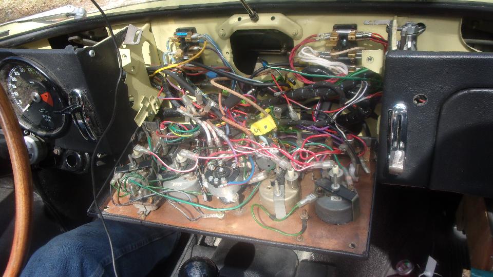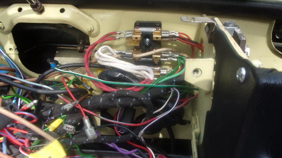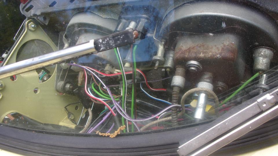 So go to the source of that wire on the ignition switch. Yes the switch works, and there is power on the white wires at the fuse. So run a long jumper wire from white wires in the dash to the coil, and it fires up and runs. Disconnect the jumper wire, and it dies. Okay, it's a 1969 model with alternator (negative earth), and it has electric tachometer with induction loop for the white wire on back of the tach. That means there is a second white wire from ignition switch to the induction loop on the tach, then following on to the coil. We never did figure out if there may be an in-line bullet connector in that wire, but after fiddling with the induction loop on the tach (just left of center in the last picture below), coil input power was restored, and the engine started and ran as normal. Score one for the good guys.