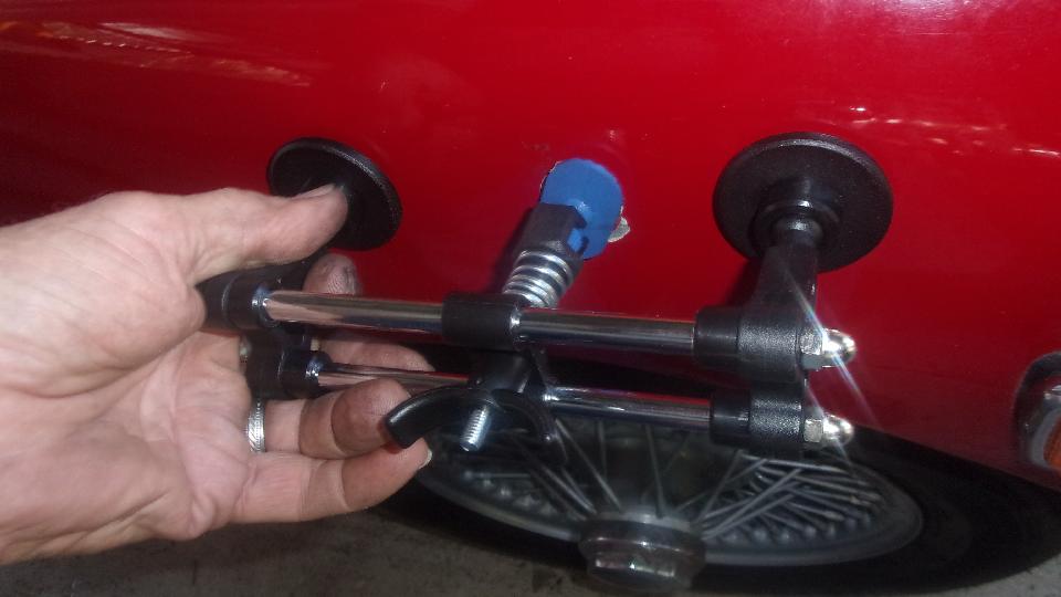 The Midget is getting close to being driveable, needing to bleed the clutch slave cylinder. Looks like the only way to have access to the bleed nipple on the slave cylinder was to remove the starter motor, which we did. Then not long to get the clutch working, and get the starter re-installed. There was a mild dent in the RF wing just aft of the wheel arch, which was a good opportunity to try out a new dent puller tool. The idea here is to stick a plastic pad in the middle of the dent, then use the special tool to pull on the shank of the pad to pull out the dent, followed by a bit of solvent and scraping off the pad. Maybe it did pull out most of the dent, but then it pulled the paint off the fender, so that was a bit disappointing.