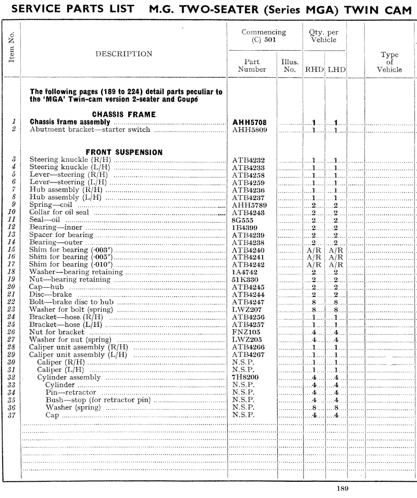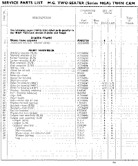 "The MG Series MGA Service Parts List" with Twin Cam Supplement. This suppliment was just a text list of the parts (38 pages) without any explosion drawing illustrations, and it was tacked onto the end of the MGA (1500) SPL.. It is only now that I am realizing the differences of this list from a later Twin Cam SPL, and that the early information was not included in the later dedicated MGA Twim Cam SPL. This then gives me another future project to add the early Twin Cam SPL information to my MGA Parts Index tech section (and when I might find a free week or so to do that).