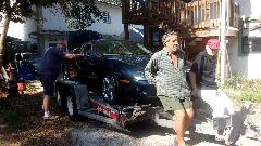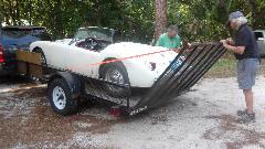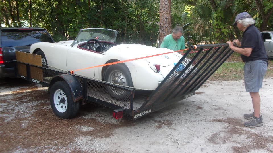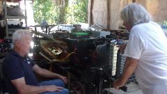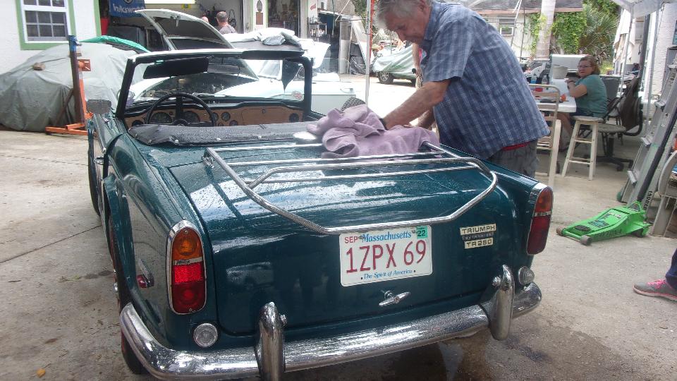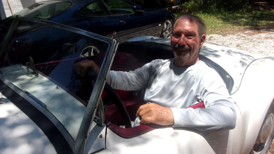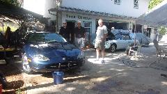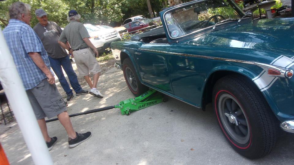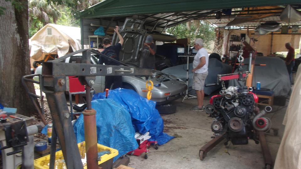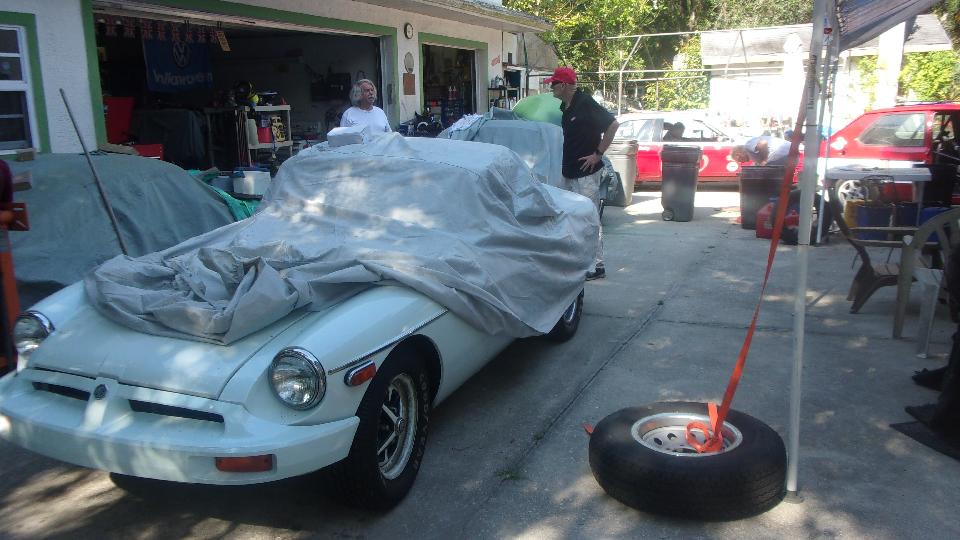 The green MGB had the freshly painted door off again for more hammer and dolly work, re-sanding, more primer, and I think it was repainted again by day's end. Sorry no picture there. Jerry and wife with truck and trailer and race car were off for the week end to go racing on east coast south of Miami.They'll be back Monday. I recon a few of us have more work to do tomorrow.