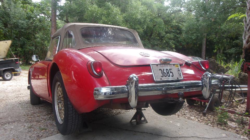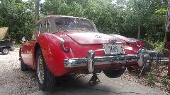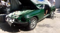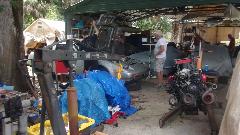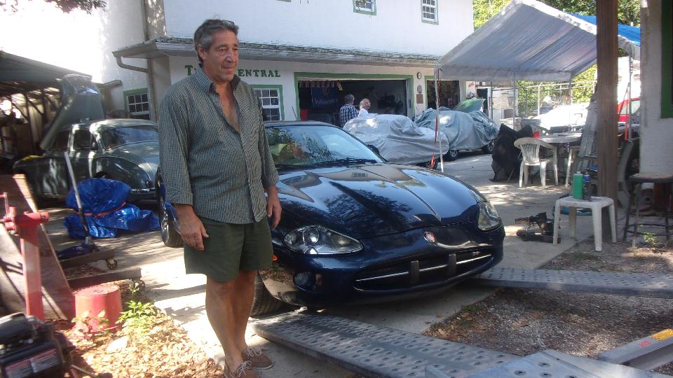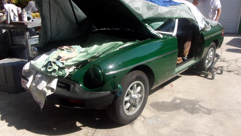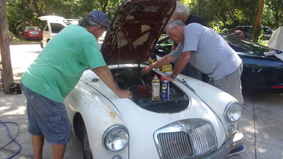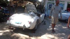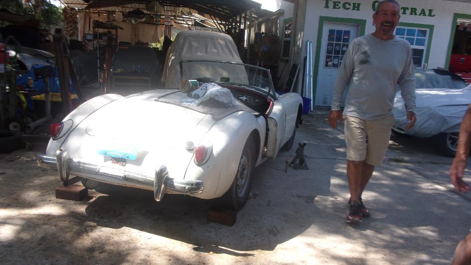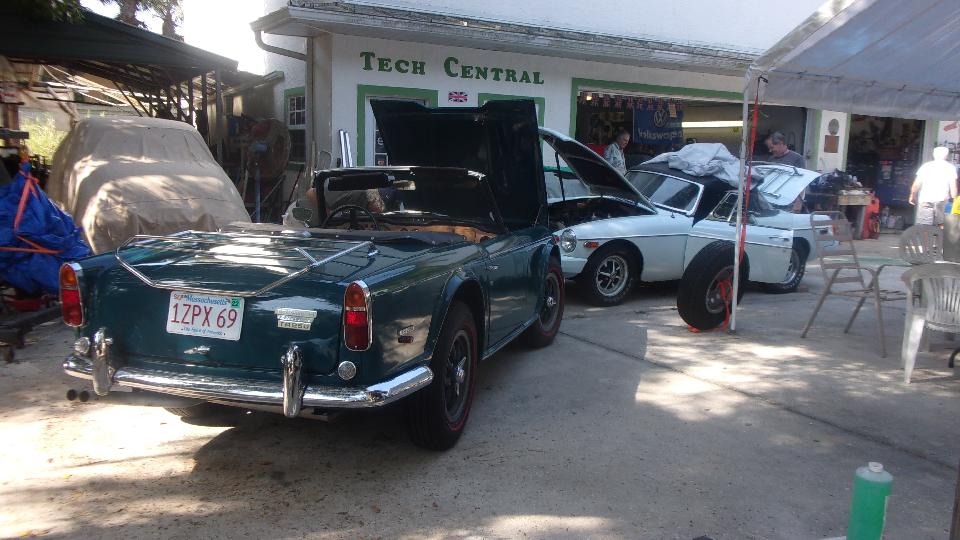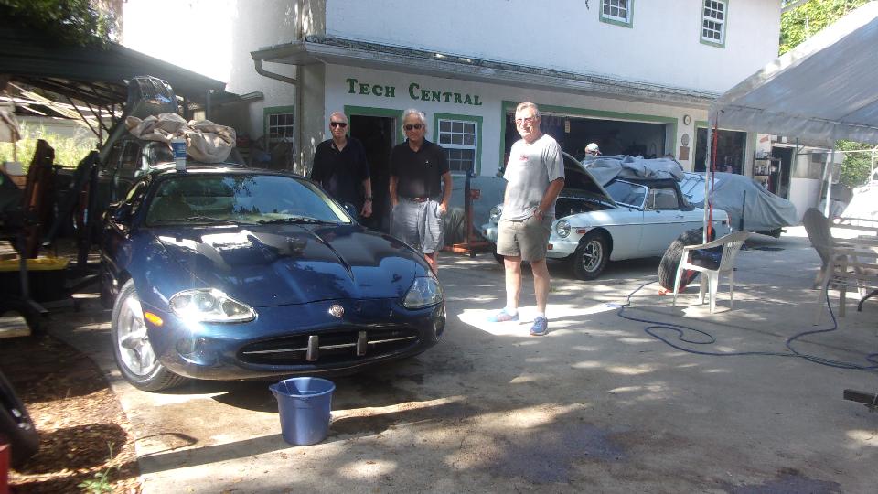 Yeah, it's Friday, and we're still in Florida, so back to Tech Central. Looks like they didn't get the Jaguar running yet, suspect a bad engine control computer, so schedule a trip to the bone yard to pick up a good used one. No one wants to admit defeat and haul it off to a Jaguar shop to pay a big service bill. The green MGB is still getting more sanding and repaint work, and surely this is not the end of it..