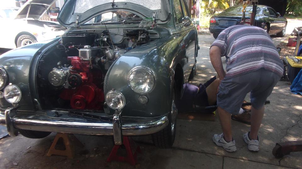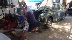 The Magnette has the gearbox rear mount all properly aligned and welded, engine and gearbox out to attach all the rubber bits and rear mount. Shifts through the gears okay, but no connection for the reverse light switch. Some parts missing for the link between the remote shift rod and the switch, so put that away while we look for the required parts. Put the 1800 engine and overdrive gearbox back into the car, for the last time we hope.