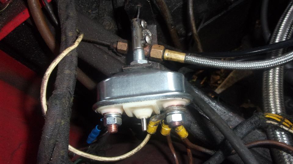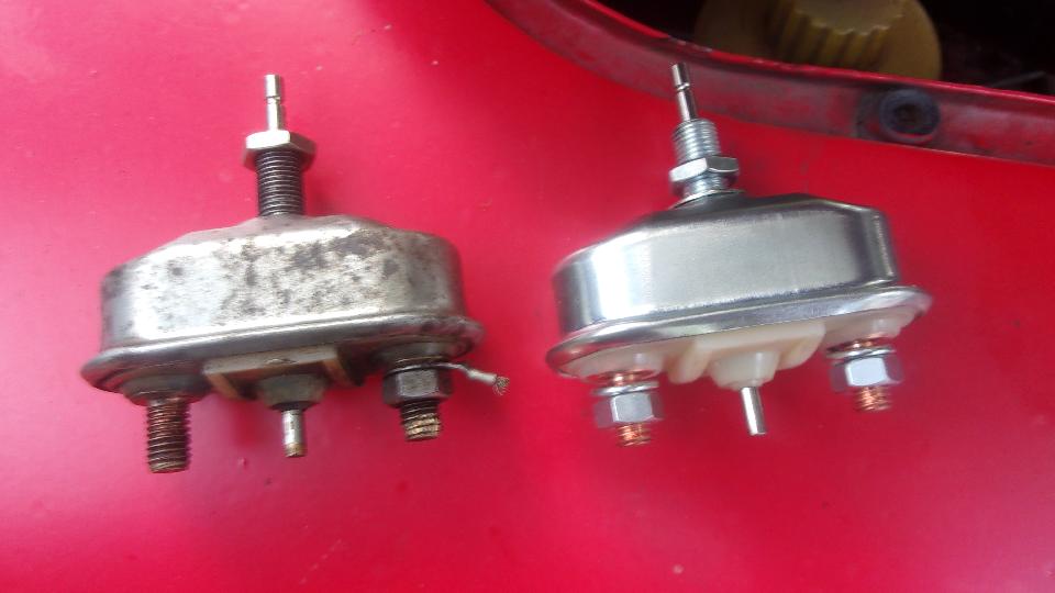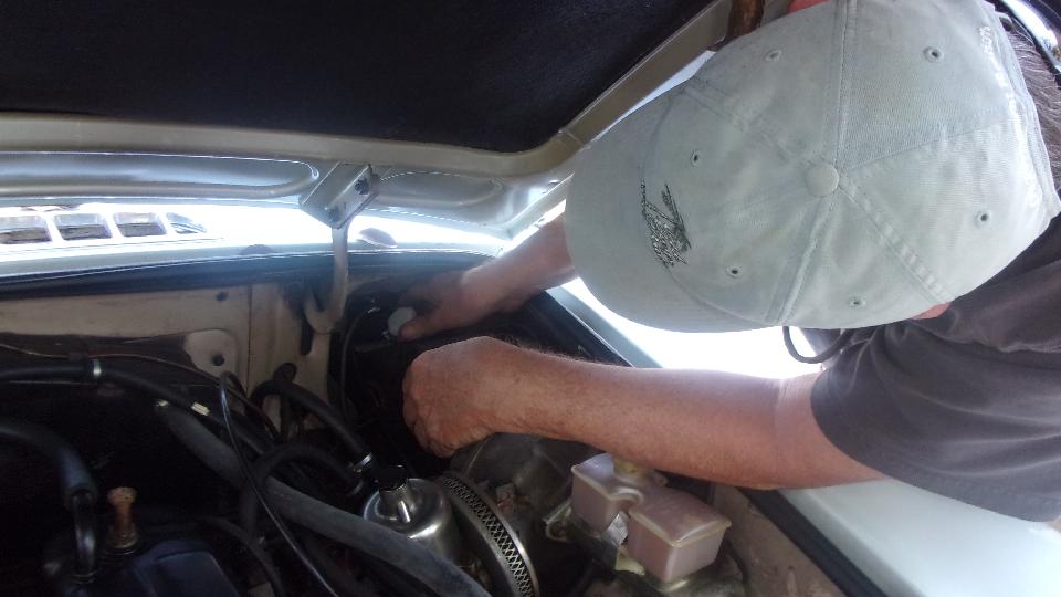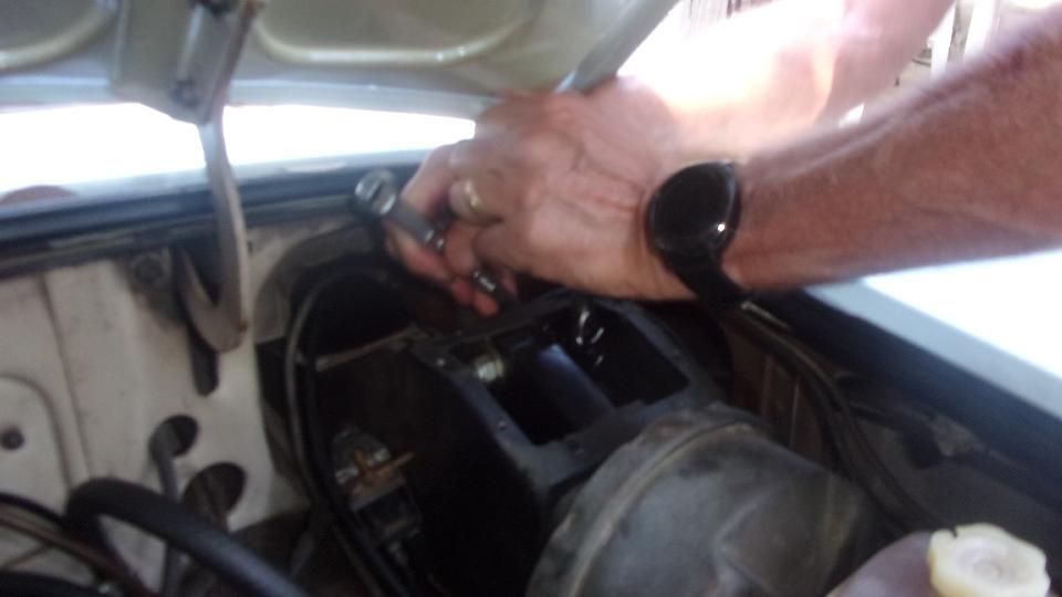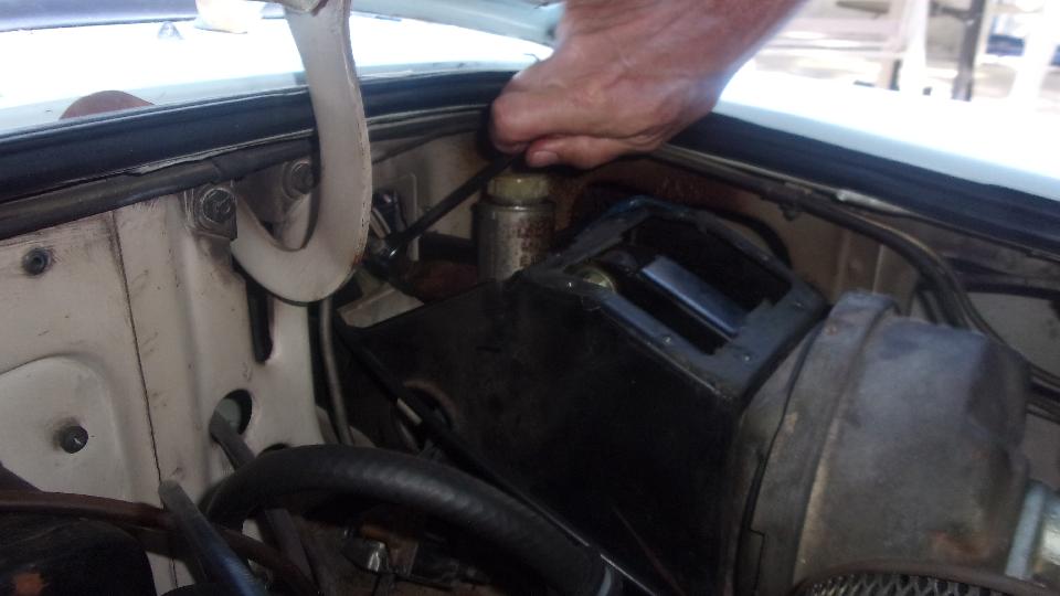 Then on to the starter pull switch swap. Pull out the 4-inch heater air hose first to clear the space, and get navigator to punch it back into round condition while I was working on the switch and wires. These are really crappy Chinese switches from Moss Motors. You have to fight with them for an hour, because the threaded mounting barrel is free to rotate in the housing, and the terminal studs are also free to rotate in the internal plastic body, so you can't assemble it and can't disassemble it with a wrench. You end up holding the wire terminals with a thin nose Vice-Grip while wrenching on the nuts. The one remaining wire I just cut and installed a new wire end, because I couldn't get the nut off.