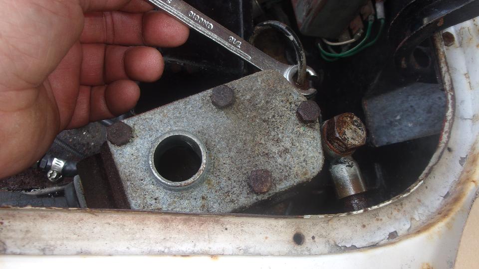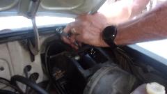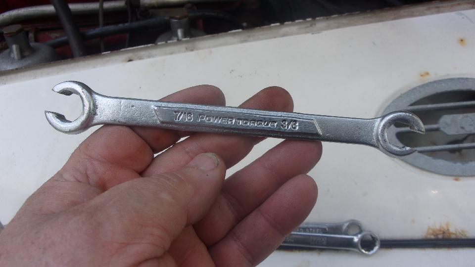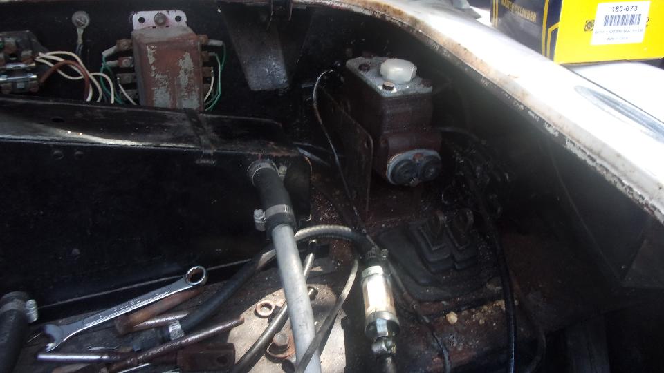 Then cam the big challenge of the day, which would get worse as the day wore on (with lots of sun and heat). The white MGA 1500 that got the clutch adjustments last week was back with a new master cylinder to be installed. Okay, unbolt the old master cylinder and pull it forward for access to the hydrulic pipe connections on the back end, Get the right flare nut wrench out of my tool box to do this job right.