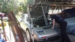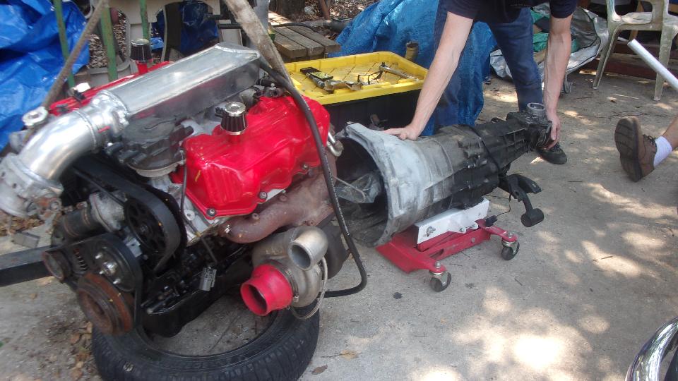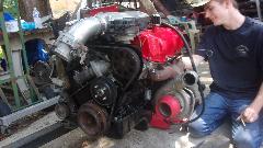 The Nissan 300ZX engine was being mated to the gearbox. Some trouble with bolt hole alignment, soon fixed with a rat tail file. In the end all bolted together, but left the starter motor at home. Be back tomorrow with that part, and hopefully get a good start at installing the power unit in the car. Nice to be young and full of energy.