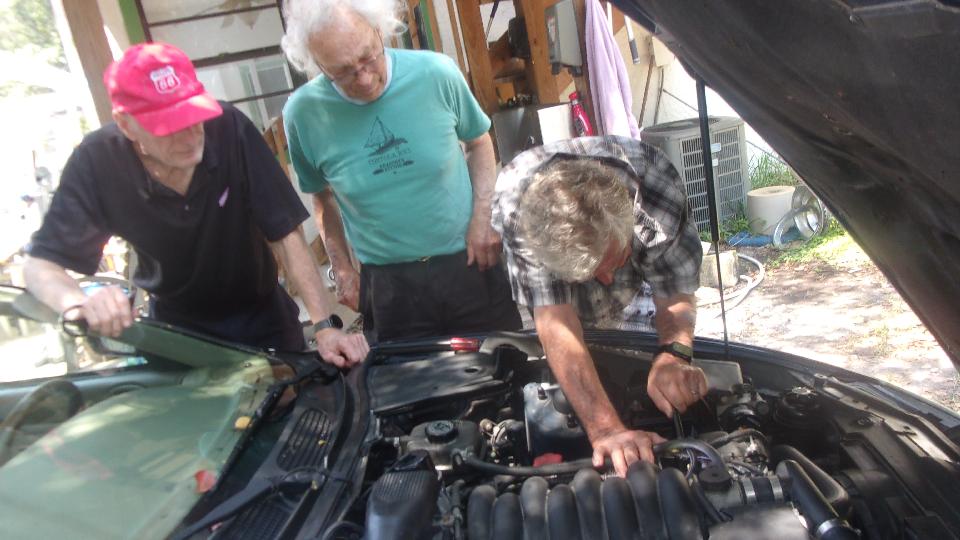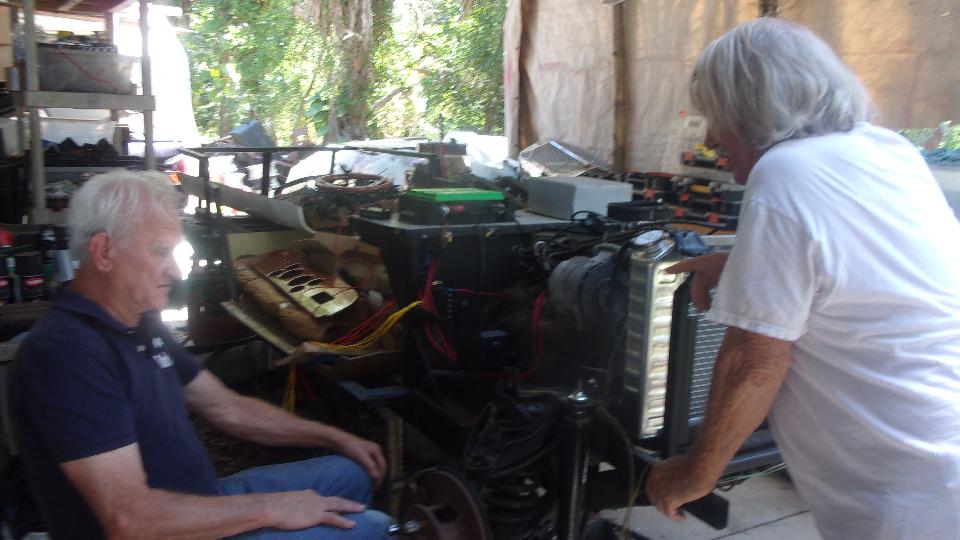 Couple guys tinkering with the Excalibur kit car (having misses last Friday's work session). Getting into electrical wiring,which will take a while to wire up the whole car. And then everybody knocked off and went home, while we headed back to our WiFi spot.