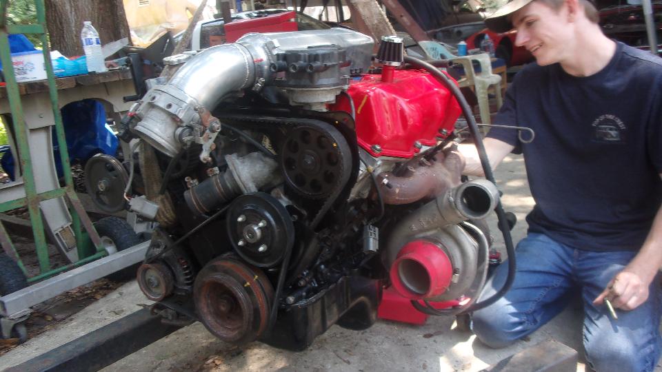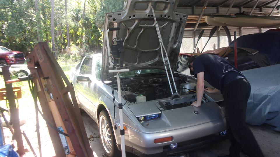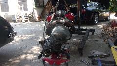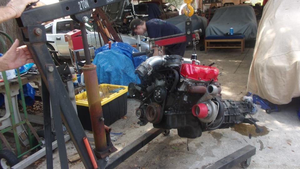 Engine and gearbox for the Nissan 300ZX have been mated and are ready to drop back into the car. After changing engine hoists for a longer reach, it seemed prudent to make a trip to the store for a bit of 3/4-inch coolant hose to connect a difficult to reach spot on the turbo-charger, so there would be a short delay. Most people had left before the hose came back, but I think Kyle and out host Jerry were going to try getting the power unit onto the mounts in the car before quits.