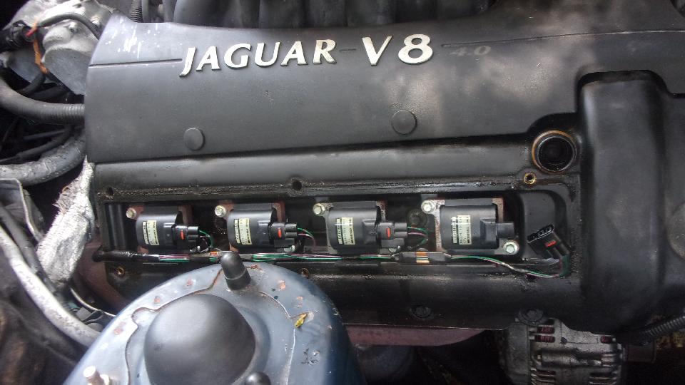 Ah, a feel good day, time to play with some toys at Tech Central. A Jaguar XK8 came in on a trailer today from the other coast. Hasn't run for two years, suspect failed fuel pump, and stale gas of course. Surprise, the fuel pump does run, and it has plenty of pressure at he fuel rail up front. New battery, engine cranks over but does not fire, not even with a sniff of starting fluid. This implies no spark.