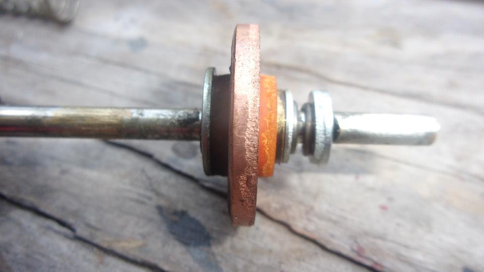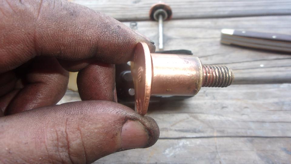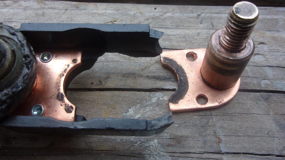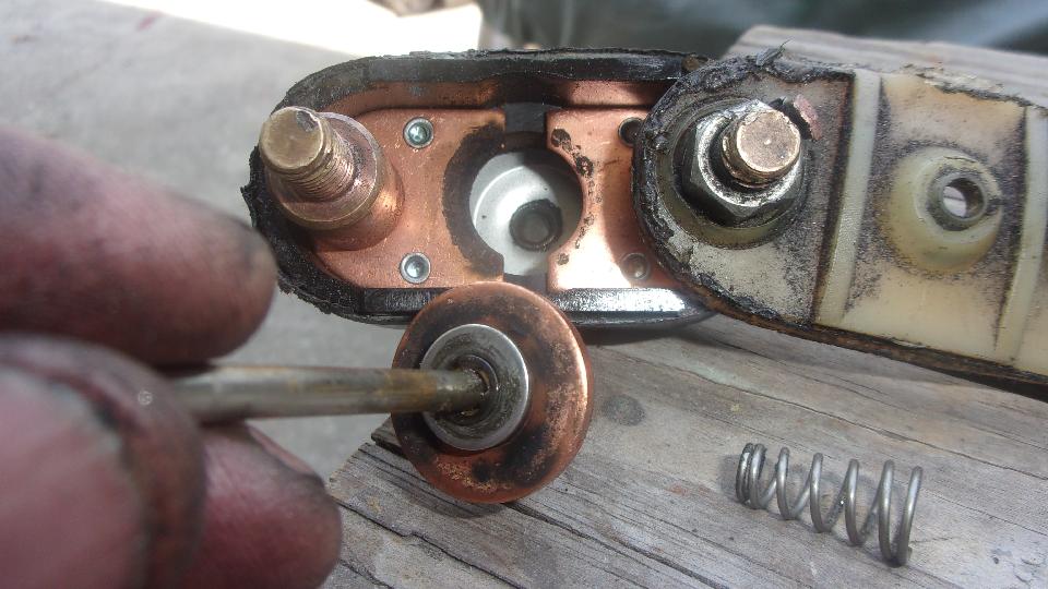 and poor manufacture. I punched out two rivets to extract one of the side contacts. The worst functional problem here is the round post is secured to the flat plate by a tiny round shank peened over like a rivet, and there is no way to prevent that from turning and coming loose to break the electrical connection while trying to tighten the terminal nut. This should have a square shank in a square hole to prevent rotation (or be welded together).
