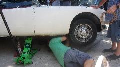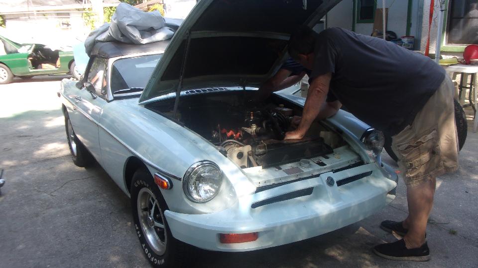 The white MGB hasn't moved for a few weeks. Now trying to get the lower bolt started in the new clutch master cylinder. If that's all they get done today, it might be considered a major accomplishment.
