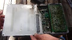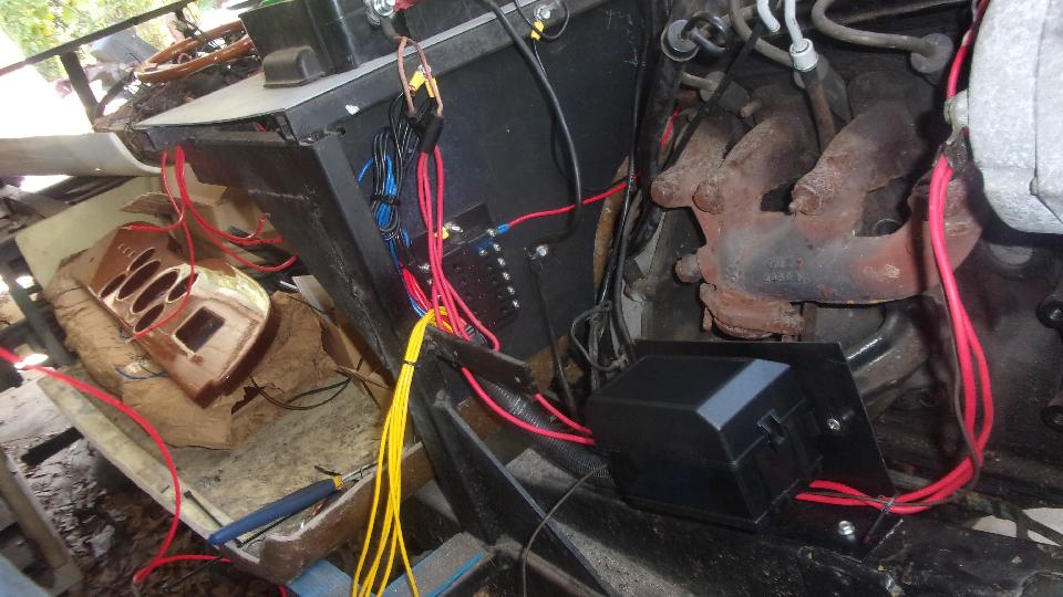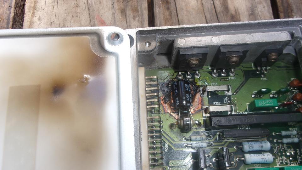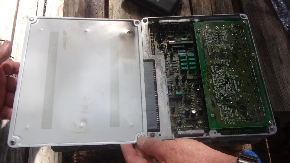 They opened up the old engine control computer, and found one corner of the board totally fried, so hot that it notably burned the metal covers on both sides. It looked like an electrolytic capacitor shorted out. They found a broken wire on a resistor in series with the muffin fan, figured the resistor to be bad, and laid plans to buy a new resistor at Radio Shack (30 miles away whenever someone could drive there). That may be tomorrow's chore.