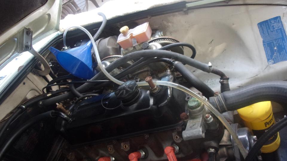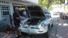 After morning email and BBS, another trip to Tech Central (likely the last time here until next December). The White MGB was getting a new hose for the clutch slave cylinder, then a bit of fun playing with bubbles in the clear hose while bleeding the clutch. That fixed, getting fuel hoses connected, on the verge of firing up the engine.