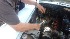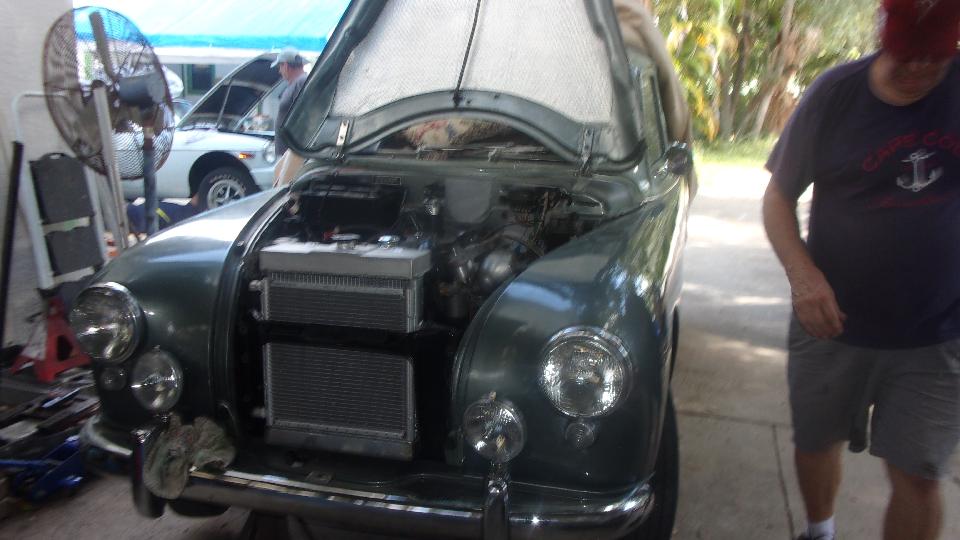 The ZB Magnette was having teething problems with the new 1800 engine and overdrive transplant (with air conditioning). New plastic fan too close to the radiator, and clutch slave hose too close to the front suspension cross member. Thinking they should have set then engine back two inches when working on the mounts. Now looking in the MGA catalog for a banjo fitting for the clutch slave cylinder to realign the slave hose.