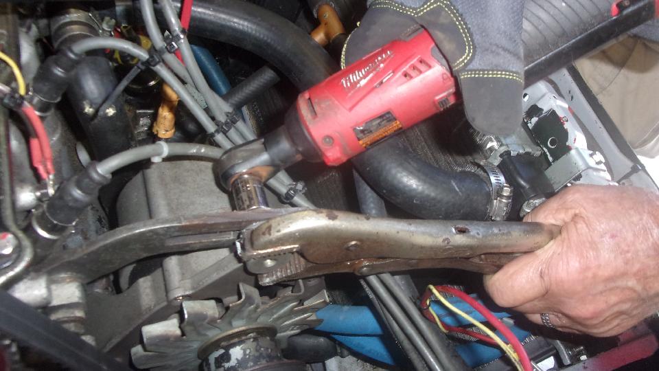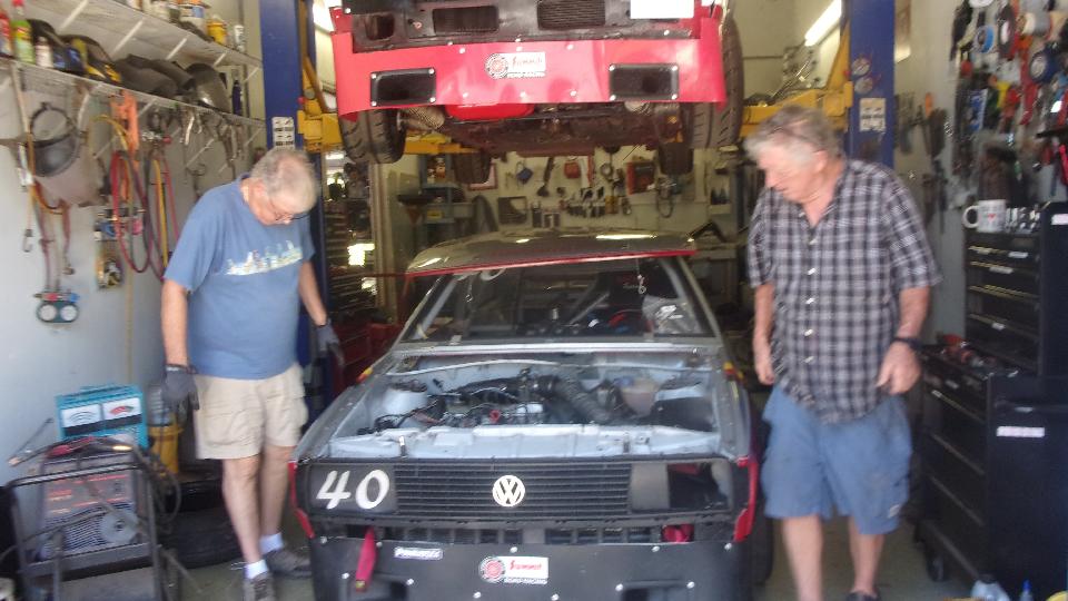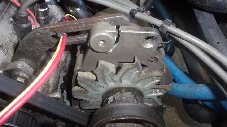 Get the Rabbit up high, and the Scirocco underneath in the shade. Needing to replace the alternator that lasted five hours in service before it broke the adjuster mounting ear.