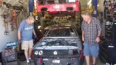 Nice day, cool in the morning, and no rain. So hustle over to Tom and Kelly Seegmuellet's place to have a look at "Mr. Tony". Kelly was all hyped up to get your car back on the road. The new tent garage was kind of nice, getting out of the cool breeze in the morning, and out of the hot sun in the afternoon (and a very nice day otherwise). No hydraulic brakes at all, and the master cylinder was empty, so pull my floor jack and jack stands out of the Magic Trailer, jack up the rear end, top up the brake fluid and start bleeding the brakes.