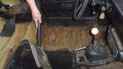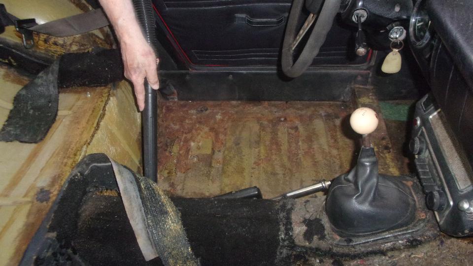 One rusty Midget with repaired suspension and patched up floor getting a bit of clean up before reinstalling the interior.