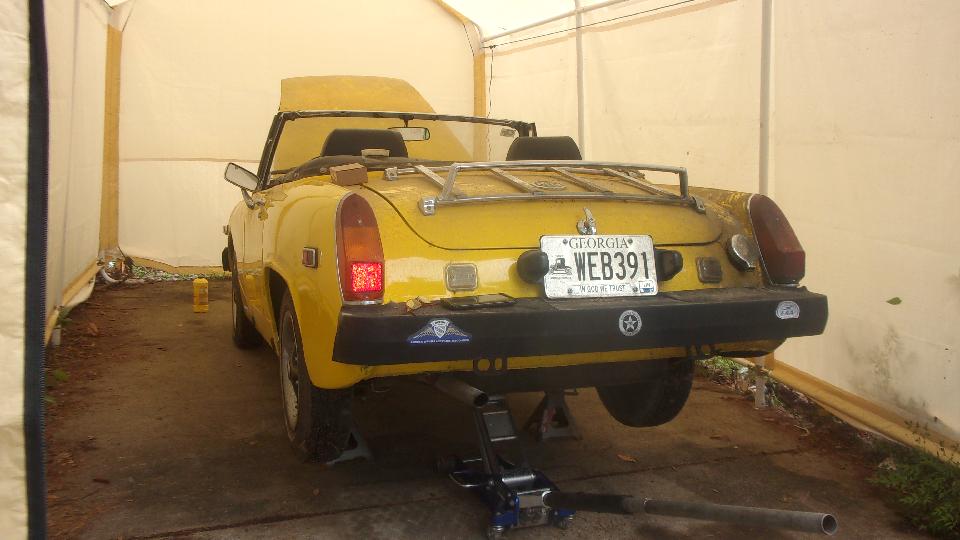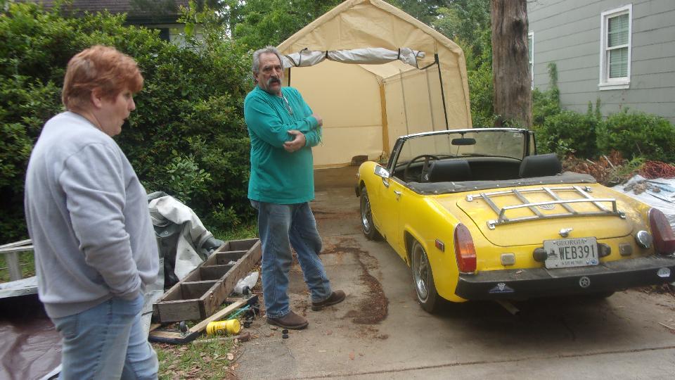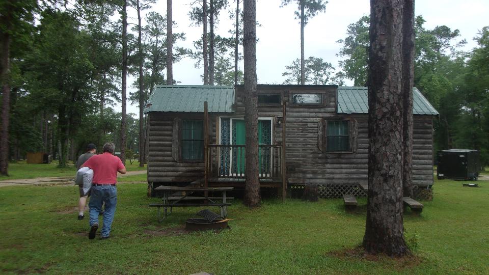 Haul out early, fuel up, grab a bag of breakfast and head north. About 180 miles on we had long escaped Florida. Another quick fuel stop in Tifton, Georgia, followed by 44 miles west to stake out a cabin at Chehaw Park in Albany, Georgia half past noon. We were in Albany this time for a tech peek at Kelly Seegmueller's MG Midget, "Mr. Tony" which seems to have lost brake fluid (with no obvious leak point). Husband Tom was trying to put up a new car tent (canvas garage), but it was pouring down rain today, so the garage wasn't done yet, and we took the rest of the day off.