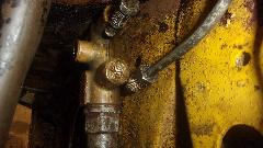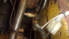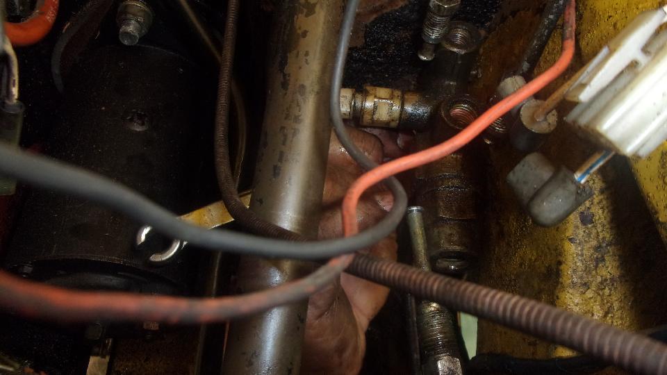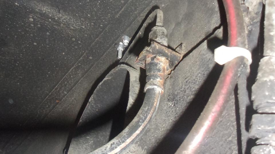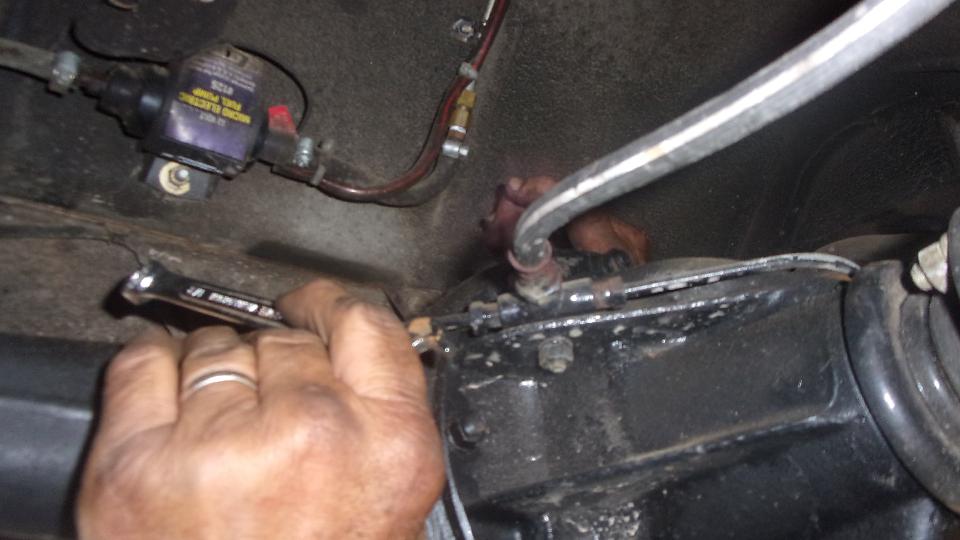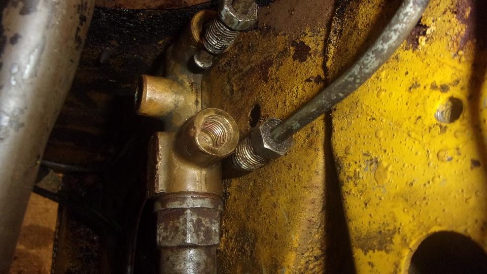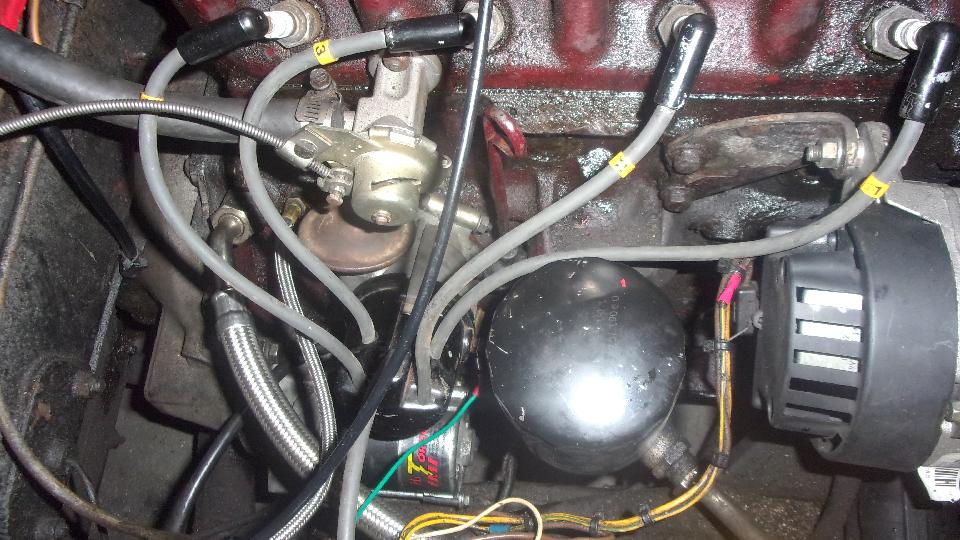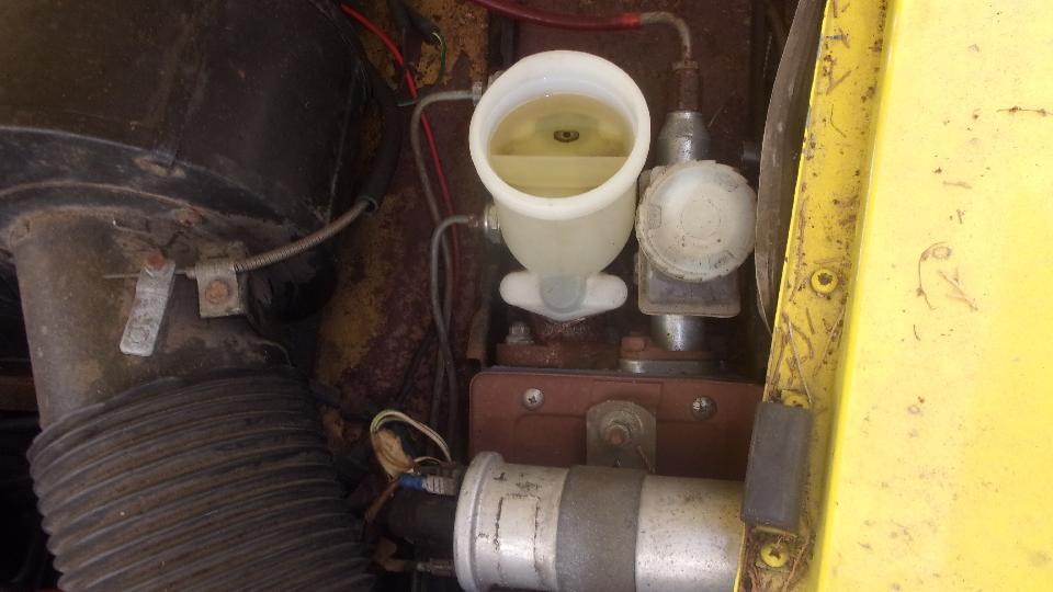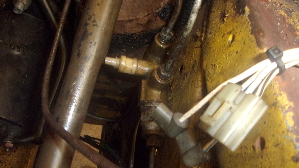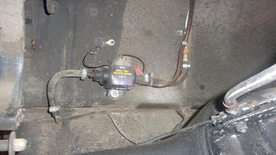 Still no fluid coming out of the rear bleed nipples, maybe just a lot of air all around, so we bled the front brakes first, which oddly enough was not much trouble, Then back to the rear, still no fluid coming out, not even with very heavy pedal force. Guessing maybe the rear brake hose might be clogged, we disconnected the feed pipe from the rear hose inlet end (getting to admire the neat electric fuel pump installation). Using Mighty-Vac to pull and pedal to push we soon had lots of fluid coming out of the feed pipe. Reattach the pipe to hose, and go back to the rear wheel bleeders, and still no fluid coming out. We adjusted the rear brake shoes properly, but full pedal force could not stop the rear wheels from turning (even though the hand brake worked very well). And the steel pipes on the rear axle were clean, not flattened. So "Mr.Tony" has had no rear brakes for a long time due to a badly clogged rear brake hose. I don't have that spare part, so put on on order, along with two front brake hoses, a clutch hose, all the related copper seal washers, and a front brake caliper repacking kit, just for good measure.