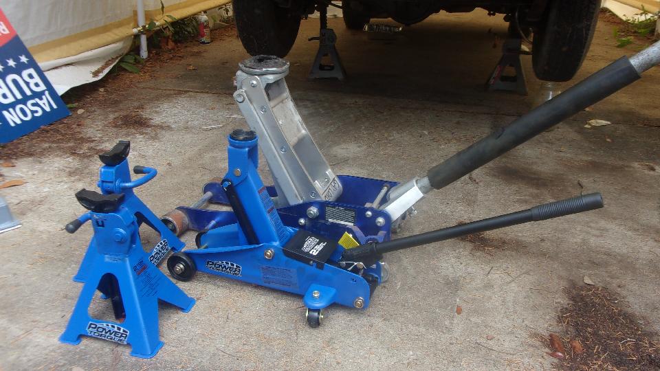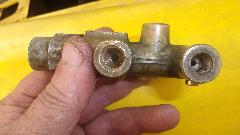 It only took a few pedal strokes to notice the fluid leak at the 6-way block up front with the dual like pressure warning light switch. Well that's not so bad, just replace two small O-rings in that assembly, bleed the brakes all around, and everything else should be good to go. Going to spend more time under the car, jacking up both ends, so Kelly ran out to a local parts store to fetch back two more jack stands. Another small floor jack came along with the jack stands, but that one is likely to end up in the dust bin or given to a neighbor. With the front end up on stands, we got busy disconnecting five pipes and a switch and one mounting bolt from the safety block.