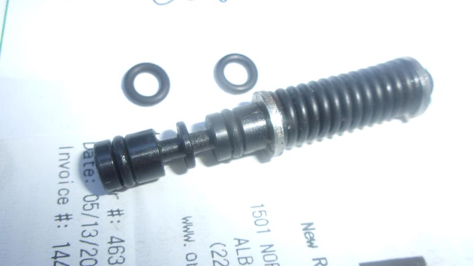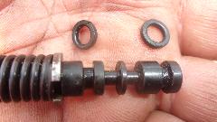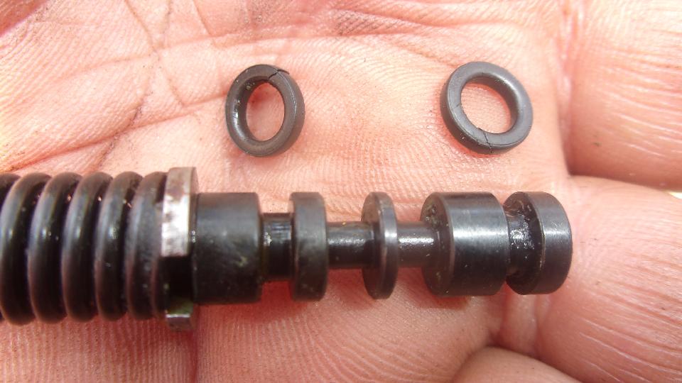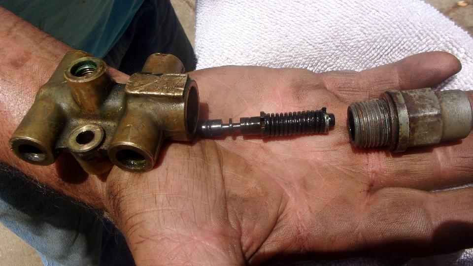 Once out of the car it required a couple of big boy wrenches to break loose the cap nut on the spool valve chamber, but we got 'er done. When the spool valve was out, we got to remove the leaking O-rings and measure the glands. Ah, peachy! The O-rings turned out to be a common standard size, 5/16" OD, 3/16" ID, 1/16" wide.