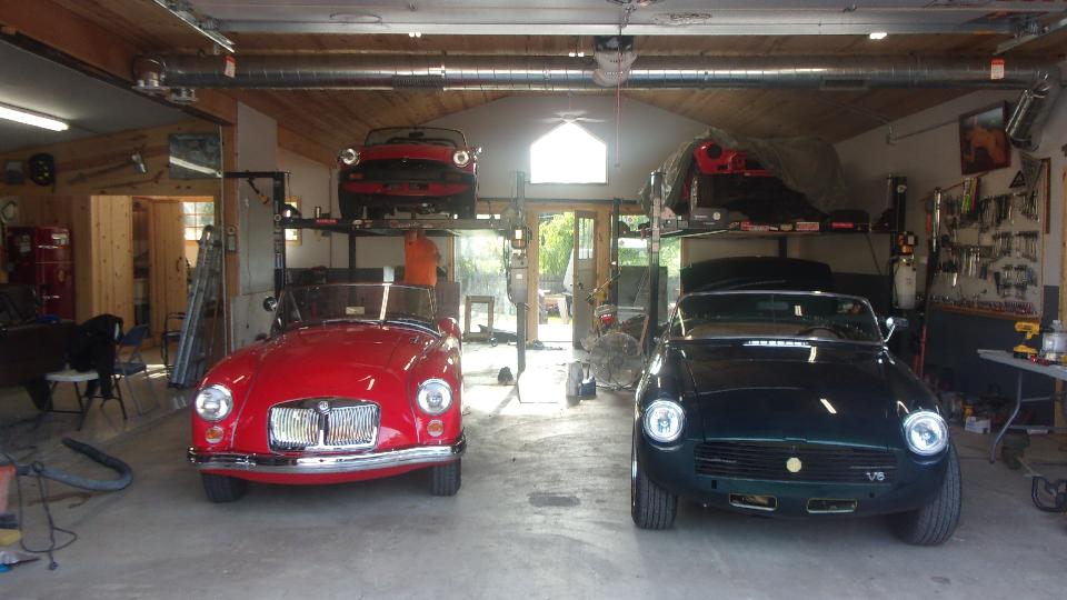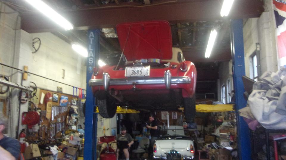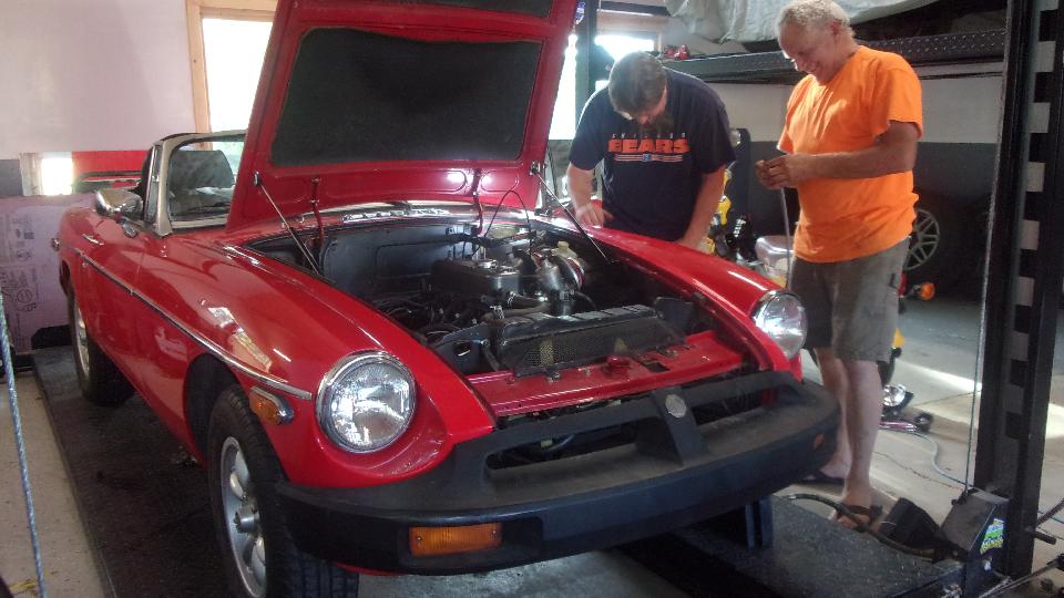 Time for our second visit to the "Wednesday Night Garage Club". in Lagrange Highlands, IL (two weeks since our last visit). Mostly working on the MGB in rear left, on hoist in first picture, then lowered on 2nd picture. This one recently lost its V6 engine (destined for another car) and gained an original style 4-cylinder (not original to this car), now belonging to Paul Pickley. The new speedometer cable form Moss had the output end screw sleeve too small, so no go, but it could run and drive without that instrument.