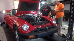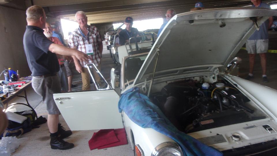 Out the door and down the hall, a very special MG TD that would be the "guest of honor" for a tribute tomorrow evening. Had a good breakfast, so skipped lunch to have a little time With J.T.'s rolling tech session. The first MGB is typical. The second one was a rare factory MGB GT V8. There is always a long line waiting for John's hands and blessing.