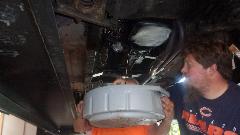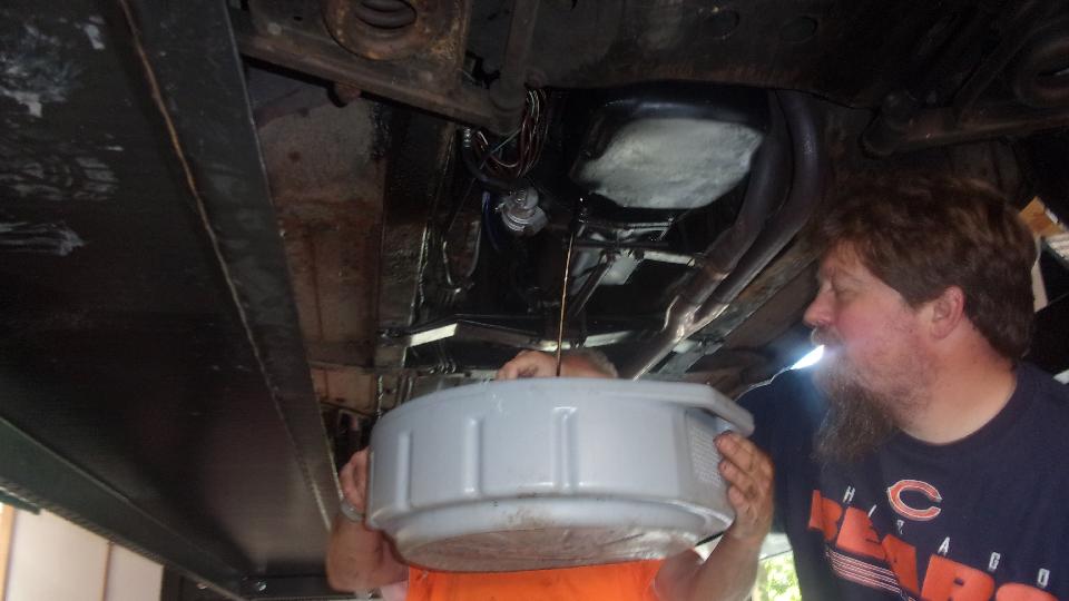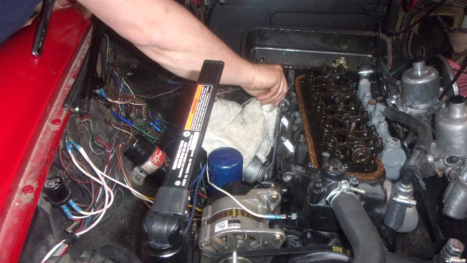 It was getting an oil change (no clue how long since the the last one), and we all though this was the night it would be running. The old drain plug gasket was shot so trying to install a new one, but the new one from Moss Motors was too large on the ID, so it slipped over the thread and nested off center in the relief neck, no go. A short hike to local O'Reilly Auto Parts brought back a spark plug that had a suitable captive washer, so the oil change was finished, and we had oil pressure.