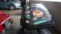Neat dash plaques. If you put enough of these together you can have a series of octagons, but so far we have two bottoms. We just take the picture and give it back, because it's too big, and we have no space to carry hundreds of these things in the travel rig. Time to get everyone together for the drivers meeting before we head out, and one late arrival after the meeting (not sure how he made out).