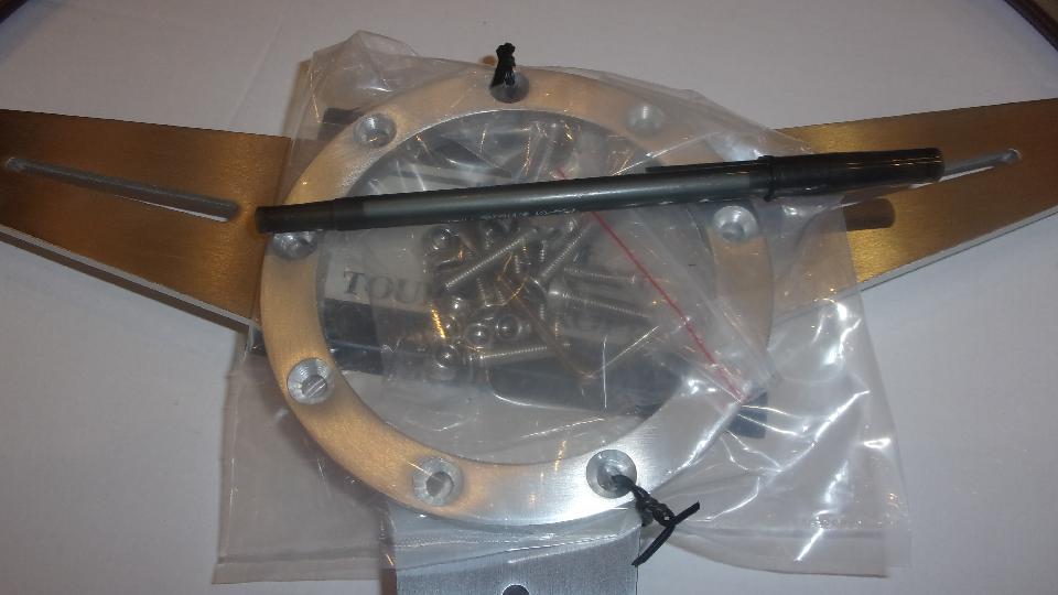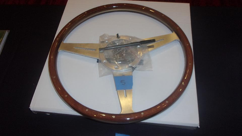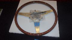 Classic Gold wood rim steering wheel. The pocket pen across the center hub was a comparator tool to measure the mounting hub to see if it would be compatible with the Moto-Lita hub currently on my car.