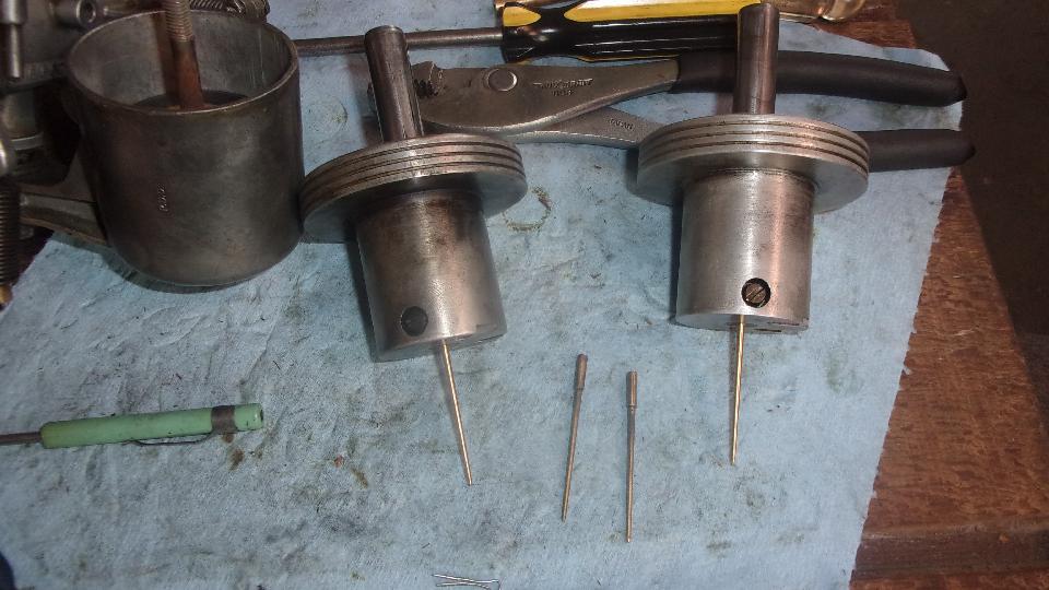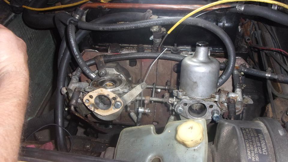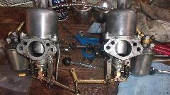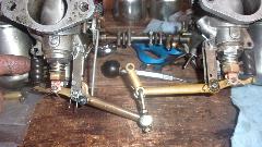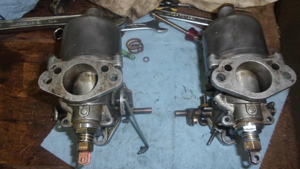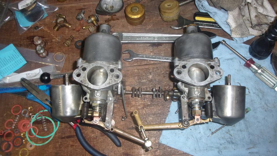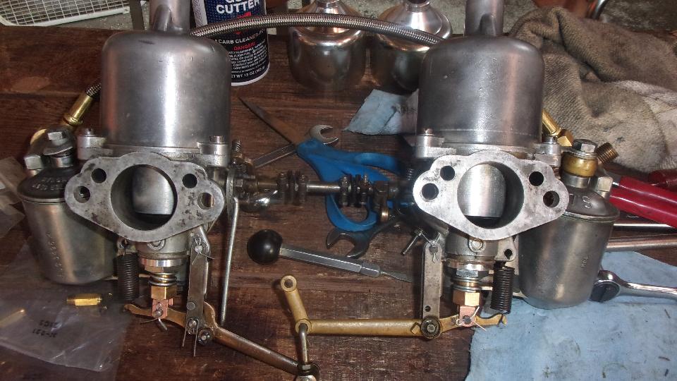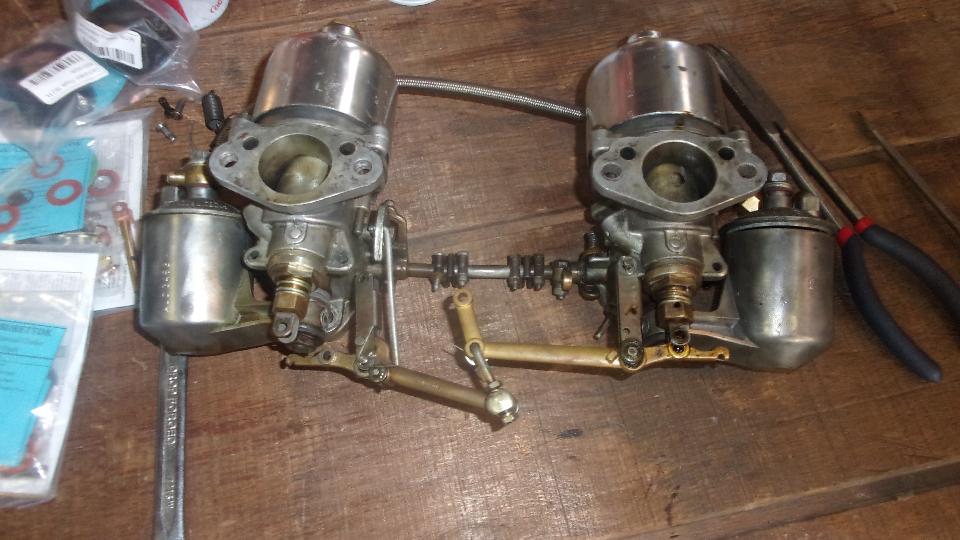 install one new Tinnerman press washer to reconnect the fast idle link. Reinstall Gross Jet fuel inlet valves, float arms, float chamber covers, overflow/vent banjo fittings and fuel hose between carbs, and they were ready to go. Then expecting to go install them on someone's car, but apparently there was no appointment for that, so no-go.