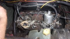 Then we really got busy, thinking we could get it finished and drive away by end of day (wishful thinking), and I didn't get any more pictures (oops). We installed the carburetors (sans air cleaners), then the water pump pulley and fan blade (without moving the alternator). The belt was a little loose, so we took a few minutes to re-adjust belt tension (while it was most convenient without the radiator in the way). Then install the radiator and all hoses and the fan shroud (kind of a pain in itself). Then a quick four small bolts to secure the oil cooler, and pour in the coolant. Surprise, coolant leak. Forgot to install the temperature sensor in the head, but that was quick and easy, and top up the coolant.