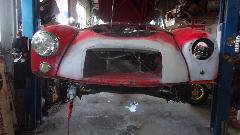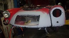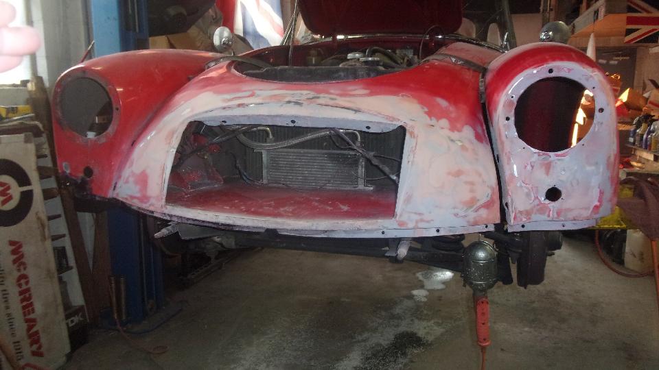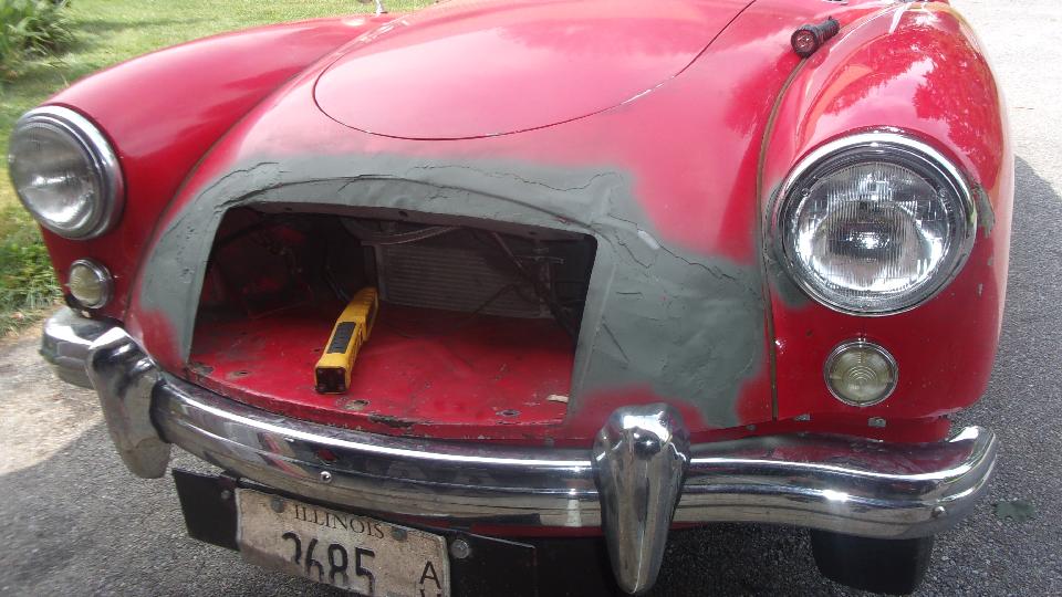 Car is running better now, starts okay, idles well, pulls hills in top gear, must have much improved compression, might be time for another compression test, just out of curiosity. Engine repaired, hydraulic leak fixed, brakes changed and adjusted, shocks oiled, the to-do list getting shorter, good feeling all around these days. Now time to get back to the body nose repair, so made a couple of phone calls. Have appointment for Sunday night social meet, maybe bleed brakes on one or two cars, and pick up the grill from Darrell's garage. Monday will then be the day to do the finishing work on the body nose and get it primed. Let that dry/cure for a day, Tuesday night regularly scheduled garage group session, and then likely do the red finish paint on Wednesday. Feels good just doing the scheduling to see the light at the end of the tunnel.