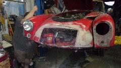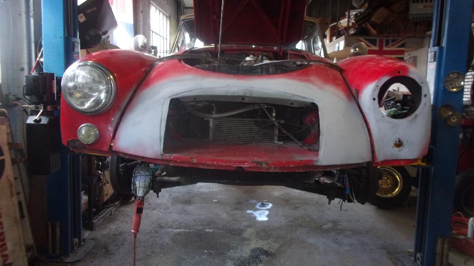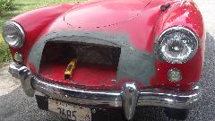 Okay, very nice working weather in Pennsylvania today, so getting back to the nose job (front body work). Arrived at Darrell's garage 11-am when he took a few minutes off of work to unlock the place. Put the Morris Minor out in the alley, unhitch trailer, get the MGA on the lift, and remove LH headlight and corner lamp. Remove front valance panel and half a dozen bolts from each front wing, wedge the wings out a bit and move half of the wing piping out of the way. That was off to a good start. Caught navigator working on the car again. This time he was cleaning out inside of the front wings, grinding out dirt and ruse with a knotted wire wheel, otherwise keeping busy with wheels of, wheels on, and packing tools and other stuff out and back into the trailer, helping mix filler and cleaning tools between applications. I recon he's learning lot today.