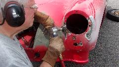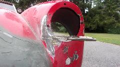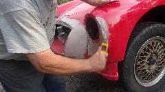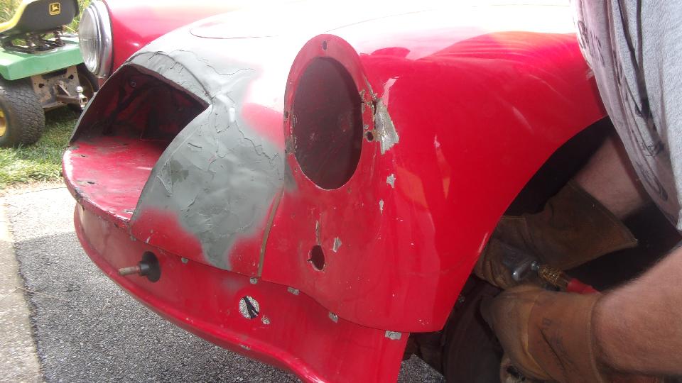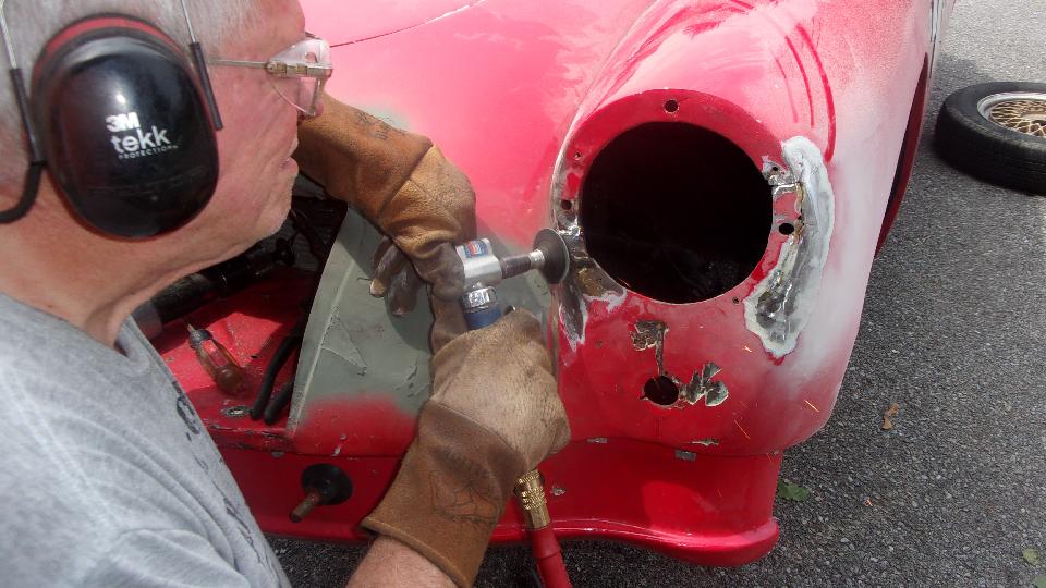 Finally comes the day to get serious about final repairs to the body nose from left over damage from five weeks earlier. Dang, there was a lot happening in between, but this has to be done sometime. We took the car back to John Valentine's place at 10-am (still in York, PA), because he has all the tools for body work. Nose up, wheels off, bumper off, headlight and parking light out. The first big boy took at hand was the air chisel with flat face punch to push out the front wing below the headlight opening. The intention here is to angle the headlight upward a bit so it doesn't point at the ground so much (which you might see in the first picture). That was a residual left over from six years ago when the headlight surround patch "eyebrow" replacement was installed a bit too far forward. Easier now to move the lower panel forward than to relocate the eyebrow.