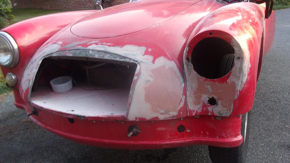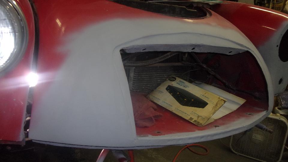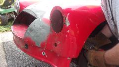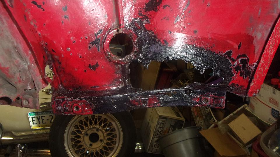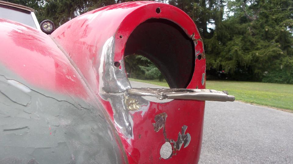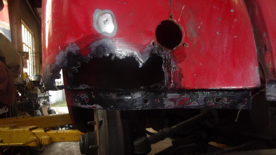 You might notice the left wing has a few small holes near the bottom edge. That was left over from a shortcut in 2015 when friends crammed some bondo in there, and left a golf ball wad of bondo behind the panel at that point. Guess it wasn't all bad as it lasted six years with nobody noticing (including me). On the RF wing there is 3 or 4 fingers size rust hole in similar location. Maybe they should have bondoed that one at the same time, but didn't. I thought for a while there was going to be a lot of rust in the chin bar in front. But that turned out to be several layers of paint over a bit of filler (from 35 or 40 years past) that had come loose, and only a touch of surface rust behind it which all sanded out quite nicely with original solid metal still in place.