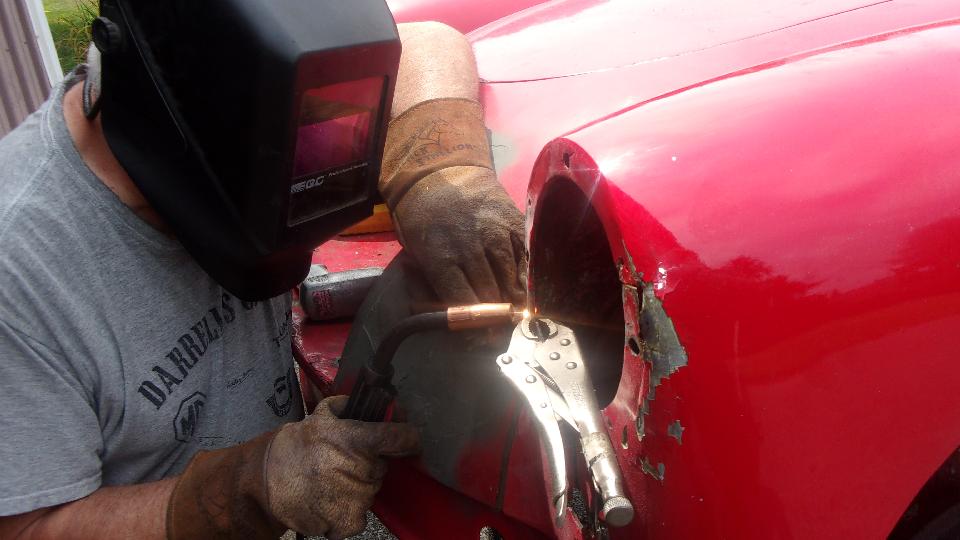 We moved on to straightening the grille surround panel for better grille alignment, pull here, push there, weld some cracks, do some grinding, and some hammer and dolly work. Stuff was getting done, slowly but surely about as expected, except by 2-pm we had lost the morning shade and were working in full sun with ambient tempearture in the mid 90's. Suffering from heat stroke, we had to call it off about 2:30, put the wheels back on the car to go find air conditioning and lunch, and we will be back a little later.