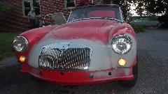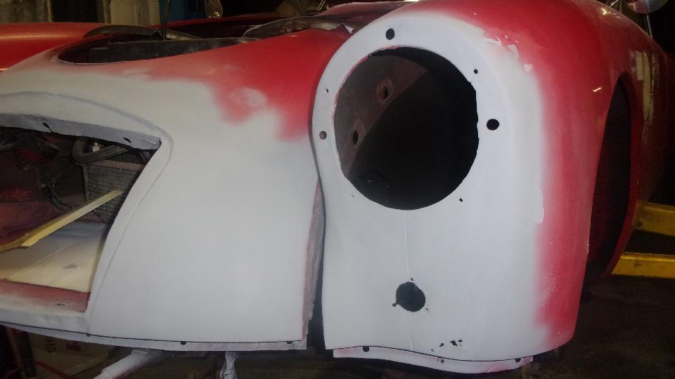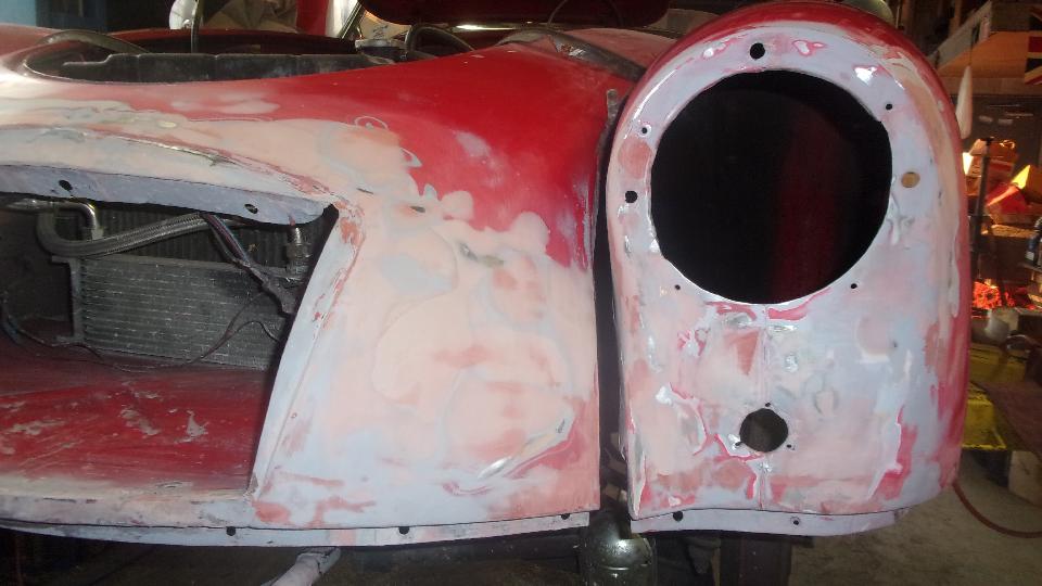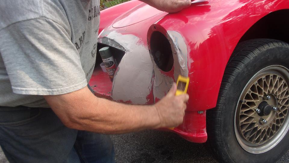 Above left, noonish start. Above right, 9-pm quitting time, after several hours of serious piddling around.. Kind of hard to tell the difference when we keep adding primer paint to be "not-as-ugly" when we go out in public.but it sure looks a lot better close up after another day's work. Of course I'd starve if I was running a body shop, but it's my car, and my pride (for whatever that's worth). But more important, it's what I preach, a heavy dose of independence and sweat equity. Do it yourself and save a bundle. Three views in the evening just before roll out. It still needs a bit of filler in few low spots, which should be easy in a half day tomorrow.. Always looks better with the lights and the grille in place (and one bolt near front of each wing). Grab a smile and feel good before putting the grille back in the box.